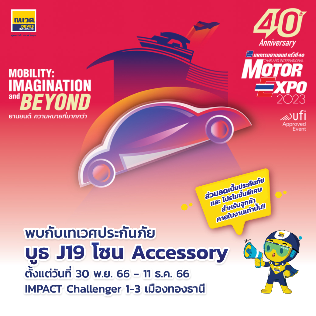 บริษัท เทเวศประกันภัย จำกัด (มหาชน) ขนทัพโปรโมชั่นจัดเต็ม พร้อมส่วนลดสุดพิเศษ เสิร์ฟลูกค้าแบบ Exclusive ในงาน “มหกรรมยานยนต์ ครั้งที่ 40” หรือ Motor Expo 2023 ตั้งแต่วันที่ 30 พ.ย. – 11 ธ.ค. 66 ณ บูธเทเวศประกันภัย J19 โซน Accessory อาคารชาเลนเจอร์ 3 อิมแพ็คเมืองทองธานี