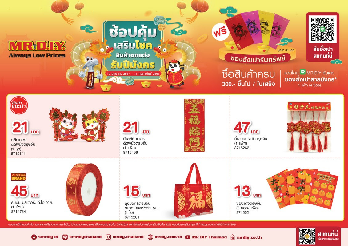 นอกจากนี้ เมื่อช้อปสินค้าตกแต่งต้อนรับเทศกาลตรุษจีน หรือสินค้าภายในร้านมิสเตอร์. ดี.ไอ.วาย. ครบ 300 บาทขึ้นไป/ใบเสร็จ* พร้อมแอดไลน์ MR.DIY รับซองอั่งเปารับทรัพย์ลายมังกร มูลค่า 39 บาท 1 แพ็ค (4 ซอง) หรือจนกว่าสินค้าจะหมด และสิทธิพิเศษกับบัตรเครดิต กรุงศรี แลกรับเครดิตเงินคืนสูงสุด 12%** เงื่อนไขเป็นไปตามบริษัทฯ และบริษัทบัตรฯ กำหนด เสริมเฮงในเทศกาลตรุษจีนได้แล้วที่ร้านมิสเตอร์. ดี.ไอ.วาย. ในกว่า 700 สาขาทั่วประเทศ ทุกทิศทั่วไทยใกล้บ้านคุณ กับหลากหลายสินค้ากว่า 15,000 รายการ ใน 10 แผนก ได้ทุกวัน และทุกเทศกาล และตลอด 24 ชั่วโมงผ่านช่องทางออนไลน์ที่ WWW.MRDIY.CO.TH หรือมิสเตอร์. ดี.ไอ.วาย. ออนไลน์สโตร์ บน Shopee Mall ผ่านการค้นหา MR.DIY Thailand Official คลิก https://bit.ly/3hrVo7F