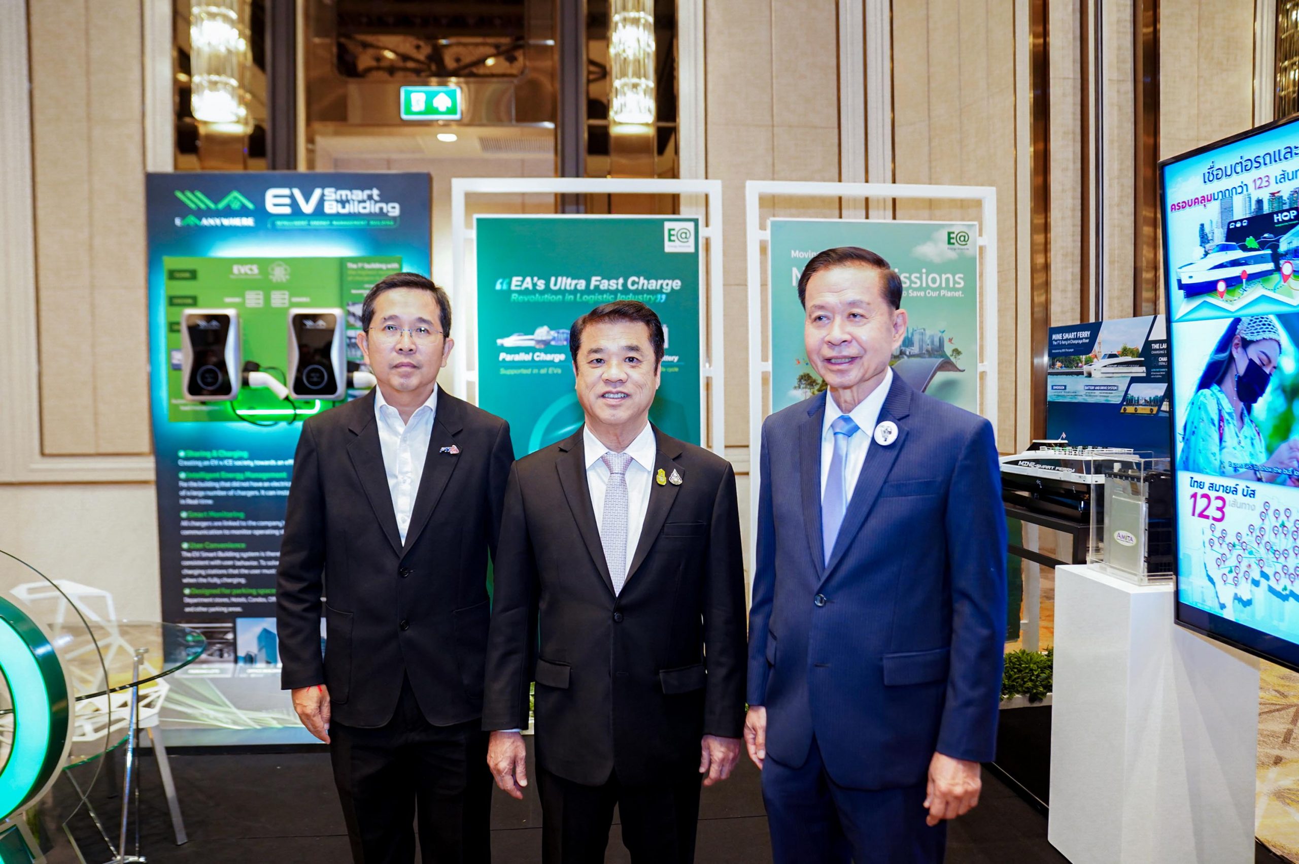 นายสมโภชน์ อาหุนัย ประธานเจ้าหน้าที่บริหาร บริษัท พลังงานบริสุทธิ์ จำกัด (มหาชน) และนายนินนาท ไชยธีรภิญโญ ประธานมูลนิธิศูนย์ข้อมูลจราจรอัจฉริยะไทย ร่วมให้การต้อนรับ นายสุริยะ จึงรุ่งเรืองกิจ รัฐมนตรีว่าการกระทรวงคมนาคม ในโอกาสเยี่ยมชมการจัดแสดงผลงานของนวัตกรรมยานยนต์ไฟฟ้า ระบบชาร์จ แบบ “EV Smart Building ภายใต้แนวคิด EA’s Electric Public Transportation: Solutions for Smart Cities” ในงาน“4th iTIC FORUM 2023: Power of Connectivity and Smart Mobility” ซึ่งงานดังกล่าวได้จัดขึ้นเพื่อเผยแพร่ความรู้ด้านการเชื่อมต่อการเดินทางและขนส่งอัจฉริยะ (Connectivity and Smart Mobility) ทั้งในประเทศและต่างประเทศ ตลอดจนยกระดับการพัฒนาระบบขนส่งและจราจรอัจฉริยะในประเทศไทย พร้อมระดมพลังความร่วมมือและขับเคลื่อนข้อมูลในการแก้ปัญหาการจราจรและลดอุบัติเหตุได้อย่างตรงจุด