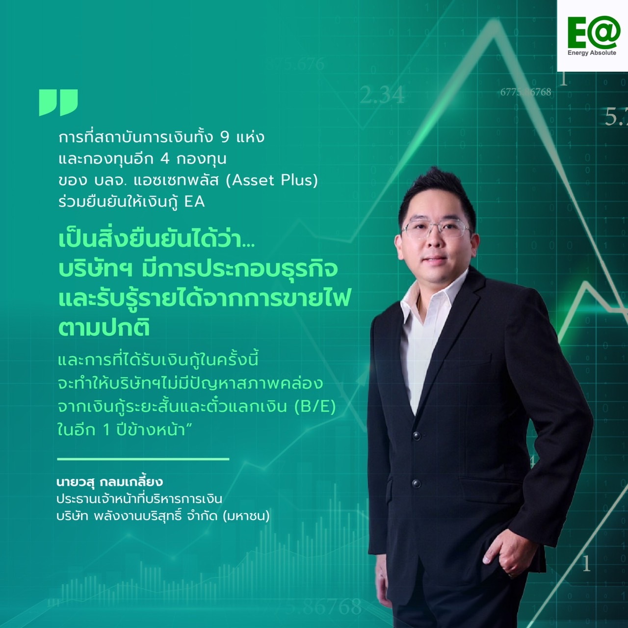 นายวสุ กลมเกลี้ยง ประธานเจ้าหน้าที่บริหารการเงิน (CFO) ของ EA กล่าวว่า “การที่สถาบันการเงินทั้ง 9 แห่งและกองทุนอีก 4 กองทุนของบลจ. แอสเซท พลัส (Asset Plus) ร่วมยืนยันให้เงินกู้ EA เป็นสิ่งที่ยืนยันได้ว่า บริษัทฯยังมีการประกอบธุรกิจและรับรู้รายได้จากการขายไฟตามปกติ และการที่ได้รับเงินกู้ในครั้งนี้จะทำให้บริษัทฯไม่มีปัญหาสภาพคล่อง จากเงินกู้ระยะสั้นและตั๋วแลกเงิน (B/E) ในอีก 1 ปีข้างหน้า”