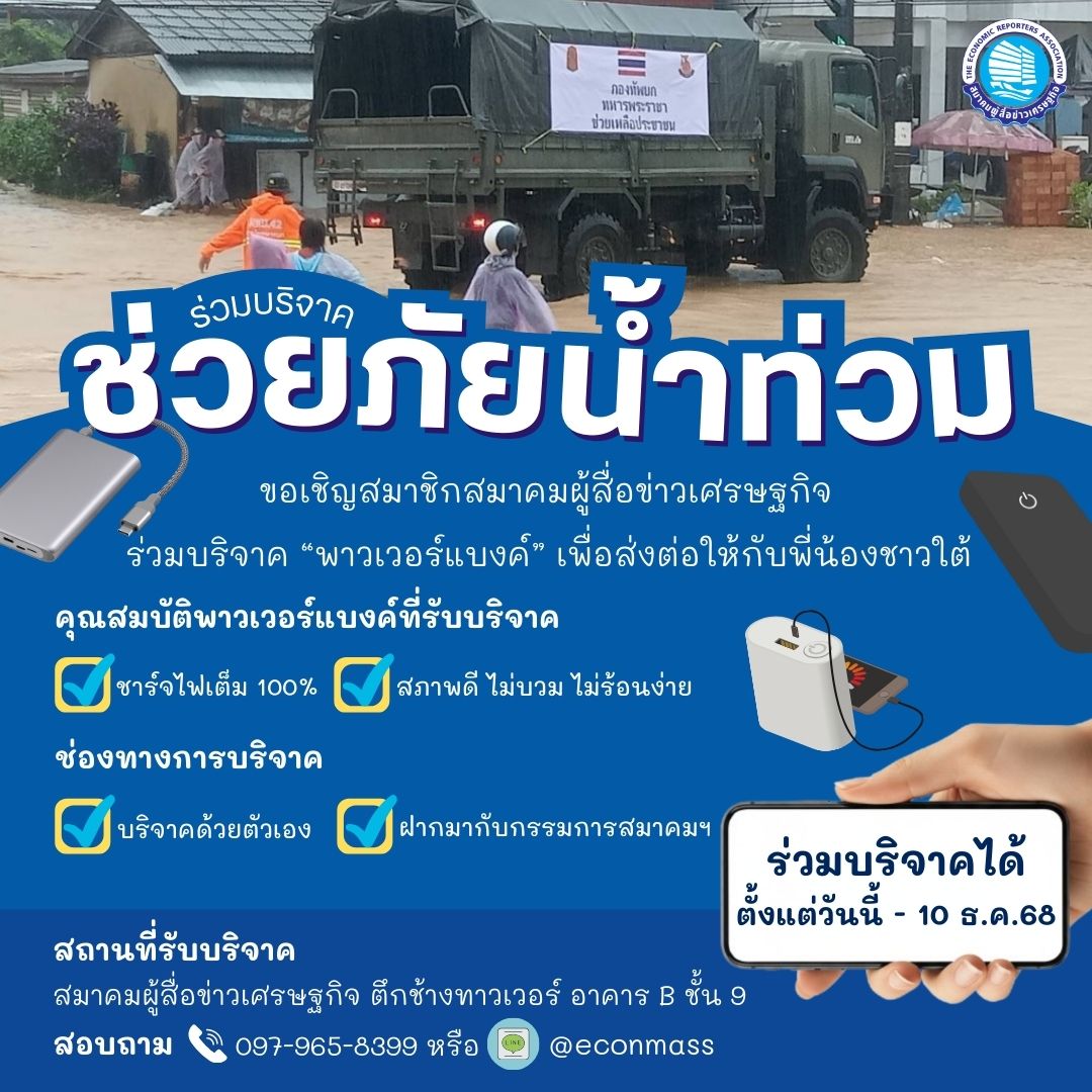 สมาคมผู้สื่อข่าวเศรษฐกิจ เชิญชวนสมาชิกร่วมบริจาค “พาวเวอร์แบงค์” เพื่อส่งต่อนำไปช่วยเหลือพี่น้องผู้ประสบภัยน้ำท่วมทางภาคใต้ ร่วมบริจาคได้ 2 ช่องทาง