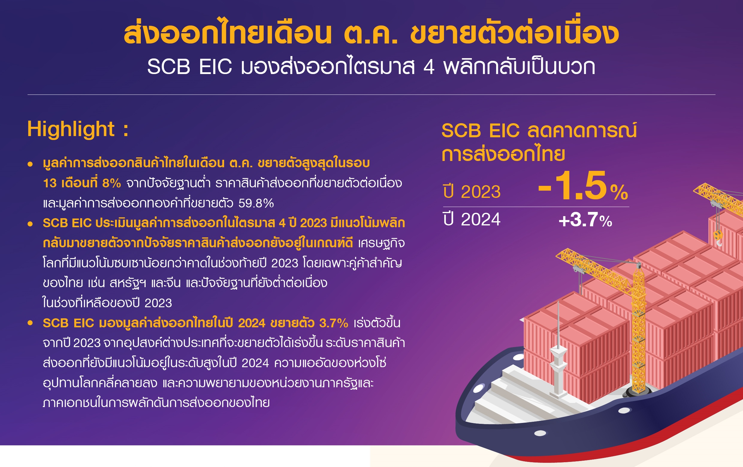 SCB EIC มองส่งออกไทยปี 2024 ขยายตัว 3.7% เร่งตัวจากปี 2023