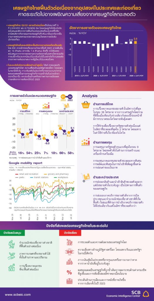 เศรษฐกิจไทยขยายตัวต่อเนื่องเป็นไตรมาสที่สามติดต่อกันที่ 2.5% เมื่อเทียบกับช่วงเดียวกันของปีก่อนหน้า และหากเทียบกับไตรมาสก่อนหน้าที่เศรษฐกิจไทยเริ่มกลับมาฟื้นตัวจากการเปิดประเทศ เศรษฐกิจไทยในไตรมาสสองยังสามารถขยายตัว 0.7% จากไตรมาสก่อนหน้า หลังปรับปัจจัยฤดูกาล (QOQ sa) โดยเศรษฐกิจได้รับปัจจัยสนับสนุนหลักจากการฟื้นตัวของอุปสงค์ในประเทศที่ได้รับอานิสงส์จากกิจกรรมทางเศรษฐกิจที่กลับมาเป็นปกติมากขึ้นตามการผ่อนคลายมาตรการควบคุมโรคและการเปิดรับนักท่องเที่ยว