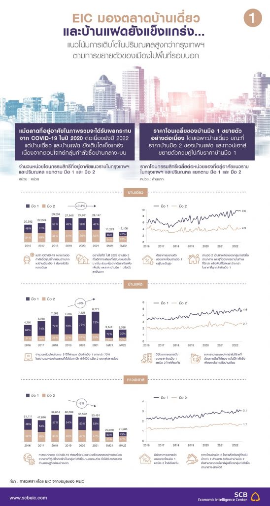 บ้านเดี่ยว : แม้ว่า COVID-19 จะกระทบต่อกำลังซื้อผู้บริโภคค่อนข้างมาก แต่บ้านเดี่ยวมือ 1 ยังคงได้รับความนิยม อย่างไรก็ดี ในปี 2565 สัดส่วนจำนวนการโอนกรรมสิทธิ์บ้านมือ 2 ปรับตัวสูงขึ้น สะท้อนว่าบ้านมือ 2 เป็นอีกทางเลือกที่ได้รับความสนใจมากขึ้น ส่วนหนึ่งจากอัตราเงินเฟ้อเพิ่มขึ้น และราคาบ้านมือ 1 ปรับตัวสูงขึ้นมาก