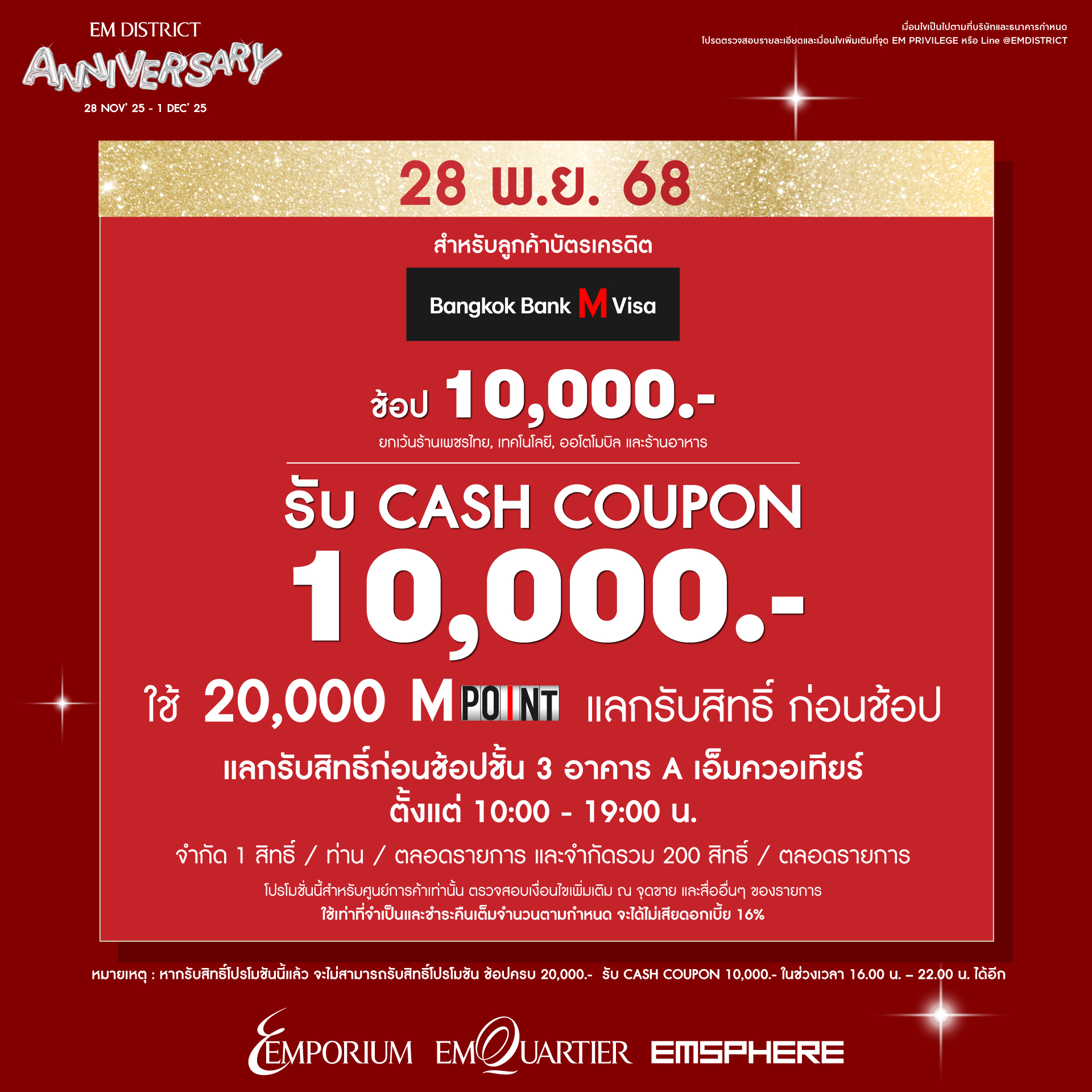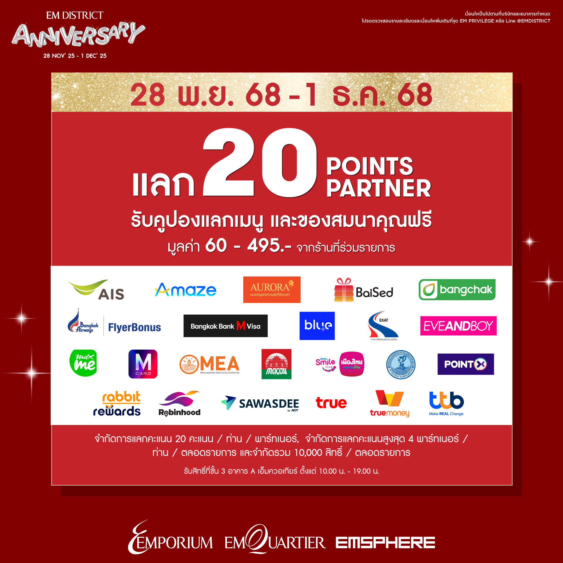 EM DISTRICT ANNIVERSARY UNSTOPPABLE HAPPINESS UNMISSABLE REWARDS มอบความพิเศษฉลองโอกาสครบรอบ 2 ปี พร้อมหลากหลายสิทธิพิเศษสุดเอ็กซ์คลูซีฟตลอด 4 วันเต็ม ระหว่างวันที่ 28 พฤศจิกายน 2568–1 ธันวาคม 2568 โดยการนำคะแนนจากพันธมิตรธุรกิจกว่า 23 พันธมิตรที่ร่วมแคมเปญ 20 คะแนน แลกรับของสมนาคุณ หรือเมนูฟรีจากร้านอาหารชั้นนำในศูนย์การค้ามากมาย”