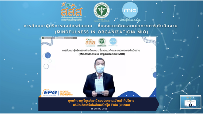 คุณชำนาญ วิทูรปกรณ์ รองประธานเจ้าหน้าที่บริหารสายธุรกิจฉนวนยางกันความร้อน/เย็น บริษัท อีสเทิร์นโพลีเมอร์ กรุ๊ป จำกัด (มหาชน) หรือ EPG เข้ารับโล่ประกาศเกียรติคุณรับรองการเป็นองค์กรต้นแบบภายใต้โครงการ Mindfulness in Organization (MIO) เพื่อแสดงให้เห็นว่า EPG มุ่งมั่นสร้างองค์กรคนดีที่มีสติ และพัฒนาให้เป็นวิถีและวัฒนธรรมองค์กรโดยส่งเสริมให้พนักงาน มีสุขภาพจิตที่ดี มีความสุขในการทำงาน เพื่อคุณภาพชีวิตที่ดีและส่งผลต่อประสิทธิภาพในการทำงาน พิธีมอบรางวัลดังกล่าว จัดโดย กรมสุขภาพจิต กระทรวงสาธารณสุข และ สสส. ผ่านช่องทางออนไลน์ เมื่อเร็ว ๆ นี้
