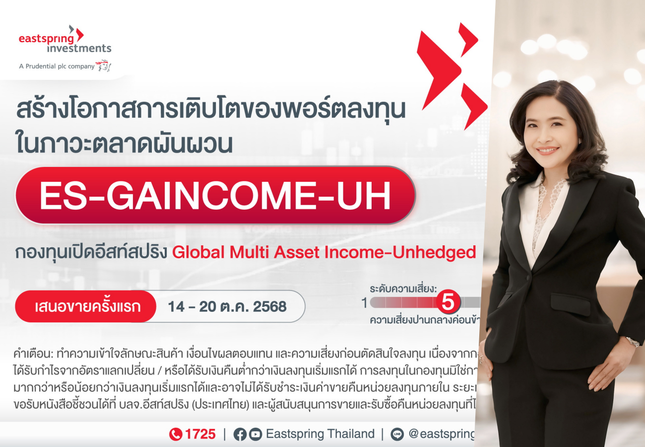 นางสาวดารบุษป์ ปภาพจน์ กรรมการผู้จัดการ บริษัทหลักทรัพย์จัดการกองทุน อีสท์สปริง (ประเทศไทย) จำกัด หรือ บลจ.อีสท์สปริง เปิดเผยว่า บลจ.อีสท์สปริงเปิดตัวกองทุนใหม่เพิ่มอีก 1 กอง ด้วยธีม Multi Asset Income จากการเสนอขายกองทุนเปิดอีสท์สปริง Global Multi Asset Income-Unhedged (ES-GAINCOME-UH) แบบไม่มีนโยบายป้องกันความเสี่ยงจากอัตราแลกเปลี่ยน มูลค่าโครงการ 5,000 ล้านบาท ระหว่างวันที่ 14-20 ตุลาคม 2568 ด้วยเงินลงทุนขั้นต่ำเพียง 1 บาท เพื่อกระจายลงทุนในสินทรัพย์หลากหลายทั่วโลก พร้อมกับโอกาสสร้างกระแสเงินสดท่ามกลางความไม่แน่นอนของดลาด ผ่านกองทุน AMUNDI FUNDS INCOME OPPORTUNITIES (กองทุนหลัก) ในหน่วยลงทุนชนิด Class I2 USD บริหารจัดการโดย Amundi Luxembourg SA ในอัตราส่วนโดยเฉลี่ยในรอบปีบัญชีไม่น้อยกว่าร้อยละ 80 ของมูลค่าทรัพย์สินสุทธิของกองทุน