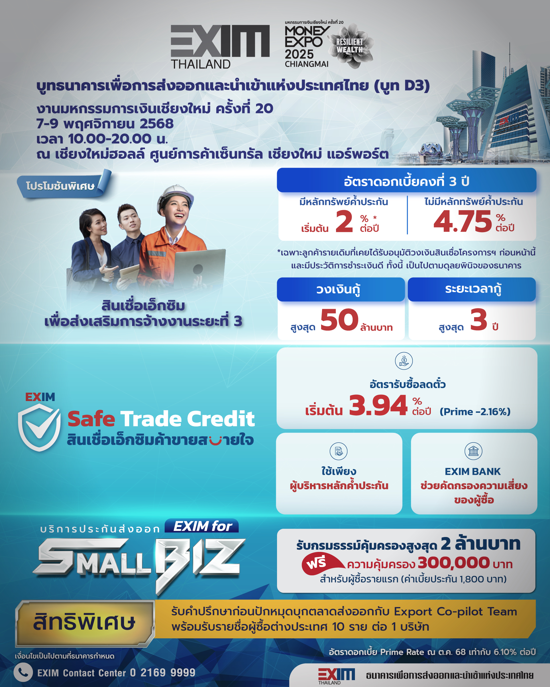 ธนาคารเพื่อการส่งออกและนำเข้าแห่งประเทศไทย (EXIM BANK) จัดเต็มบริการทางการเงิน พร้อมโปรโมชันพิเศษ ในงานมหกรรมการเงินเชียงใหม่ ครั้งที่ 20 (Money Expo 2025 Chiang Mai) ระหว่างวันศุกร์ที่ 7-วันอาทิตย์ที่ 9 พฤศจิกายน 2568 ณ บูท D3 เชียงใหม่ฮอลล์ ศูนย์การค้าเซ็นทรัล เชียงใหม่ แอร์พอร์ต ภายใต้แนวคิด “Empowering Toward a Sustainable Wealth เสริมพลัง เพื่อสร้างความมั่งคั่งอย่างยั่งยืน”