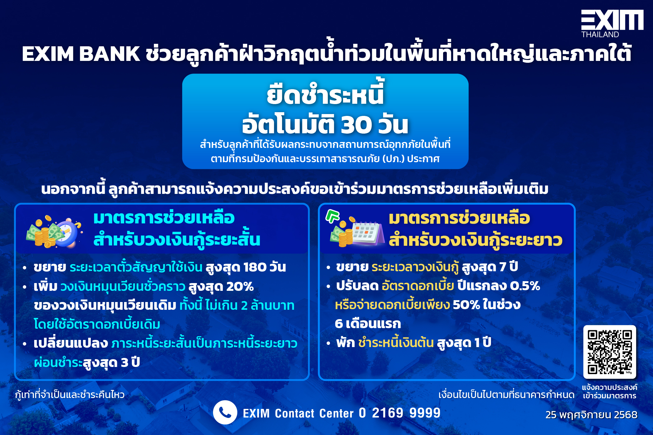 นายชลัช รัตนบุญนิธิ กรรมการผู้จัดการ ธนาคารเพื่อการส่งออกและนำเข้าแห่งประเทศไทย (EXIM BANK) เปิดเผยว่า จากสถานการณ์ฝนตกหนักอย่างต่อเนื่องจนเกิดน้ำท่วมฉับพลัน สร้างความเสียหายในวงกว้างในพื้นที่ภาคใต้ โดยเฉพาะอำเภอหาดใหญ่ จังหวัดสงขลา ซึ่งเป็นที่ตั้งสาขาของ EXIM BANK ดูแลลูกค้าในพื้นที่ภาคใต้ทั้งหมด EXIM BANK จึงออกมาตรการช่วยเหลือลูกค้าเพิ่มเติม เพื่อบรรเทาภาระทันที ทั้งในส่วนของวงเงินกู้ระยะสั้น วงเงินกู้ระยะยาว รวมถึงสินเชื่อปรับโครงสร้างหนี้ ที่ครบกำหนดชำระในช่วงเดือนธันวาคม 2568 ด้วยการยืดหนี้อัตโนมัติเป็นระยะเวลา 30 วัน เพื่อบรรเทาผลกระทบอย่างเร่งด่วนให้แก่ลูกค้าที่ได้รับผลกระทบจากสถานการณ์อุทกภัยในพื้นที่ตามที่กรมป้องกันและบรรเทาสาธารณภัย (ปภ.) ประกาศ ซึ่งอาจประสบปัญหาความยากลำบาก ไม่สามารถติดต่อกลับมายังธนาคารได้