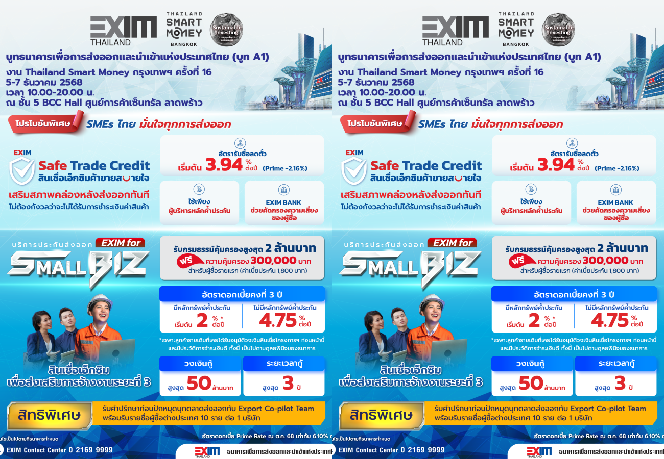 ธนาคารเพื่อการส่งออกและนำเข้าแห่งประเทศไทย (EXIM BANK) จัดเต็มบริการทางการเงิน พร้อมโปรโมชันพิเศษ ในงาน Thailand Smart Money กรุงเทพฯ ครั้งที่ 16 ระหว่างวันศุกร์ที่ 5-วันอาทิตย์ที่ 7 ธันวาคม 2568 ณ ชั้น 5 BCC Hall ศูนย์การค้าเซ็นทรัล ลาดพร้าว หมายเลขบูท A1 ภายใต้แนวคิด “Empowering Toward a Sustainable Wealth เสริมพลัง เพื่อสร้างความมั่งคั่งอย่างยั่งยืน”