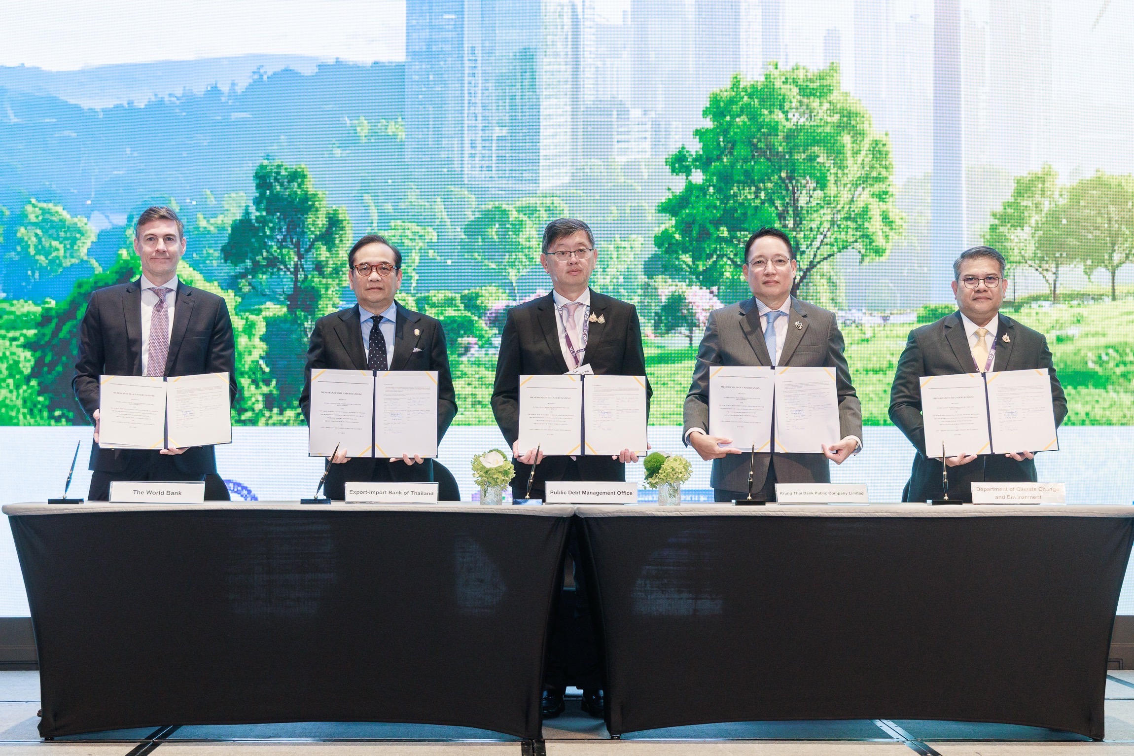 นายบัณฑิต สะเพียรชัย กรรมการ และรักษาการกรรมการผู้จัดการ ธนาคารเพื่อการส่งออกและนำเข้าแห่งประเทศไทย (EXIM BANK) นายมาร์ค โฟนี่ ผู้เชี่ยวชาญอาวุโสด้านเมืองยั่งยืน ธนาคารโลก นายพชร อนันตศิลป์ ผู้อำนวยการสำนักงานบริหารหนี้สาธารณะ (สบน.) กระทรวงการคลัง นายปวิช เกศววงศ์ รองอธิบดีกรมการเปลี่ยนแปลงสภาพภูมิอากาศและสิ่งแวดล้อม (สส.) กระทรวงทรัพยากรธรรมชาติและสิ่งแวดล้อม และนายผยง ศรีวณิช กรรมการผู้จัดการใหญ่ ธนาคารกรุงไทย จำกัด (มหาชน) ลงนามบันทึกข้อตกลงความร่วมมือในการพัฒนาโครงการเมืองคาร์บอนต่ำและการพัฒนาตลาดคาร์บอนของประเทศไทย ในงาน Asia Climate Summit 2025 เพื่อศึกษา สนับสนุน และเสริมสร้างความพร้อมในการลงทุนพัฒนาโครงสร้างพื้นฐานสู่เศรษฐกิจคาร์บอนต่ำ อาทิ การพัฒนาพลังงานสะอาด การเพิ่มประสิทธิภาพการใช้พลังงาน ยานยนต์ไฟฟ้า (EV) และเทคโนโลยีลดก๊าซเรือนกระจก โดยธนาคารกรุงไทยและ EXIM BANK ร่วมมือกันในการเป็นหน่วยงานประสานและบริหารจัดการ และรวบรวมกิจกรรมลดก๊าซเรือนกระจก การขึ้นทะเบียนคาร์บอนเครดิตภายใต้มาตรฐานสากล และการพัฒนาแพลตฟอร์มการซื้อขายคาร์บอนเครดิตภาคสมัครใจของไทยให้แข่งขันได้อย่างยั่งยืนในระดับโลก ณ โรงแรมอินเตอร์คอนติเนนตัล กรุงเทพฯ เมื่อเร็วๆ นี้