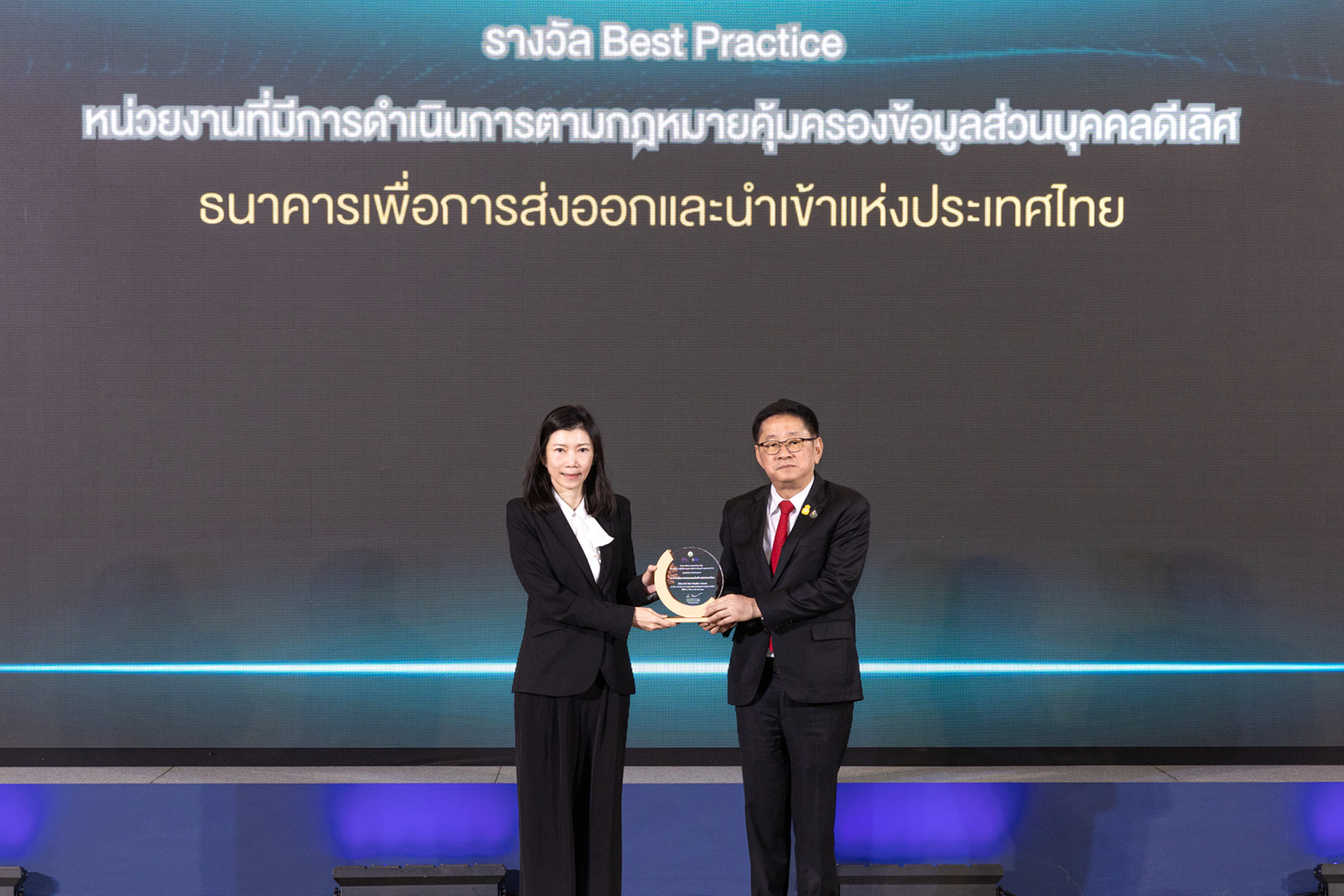 นางสาวนารีมาลย์ เจียงประดิษฐ์ ผู้ช่วยกรรมการผู้จัดการ ธนาคารเพื่อการส่งออกและนำเข้าแห่งประเทศไทย (EXIM BANK) รับรางวัล Best Practice หน่วยงานที่มีการดำเนินการตามกฎหมายคุ้มครองข้อมูลส่วนบุคคลดีเลิศ จากนายประเสริฐ จันทรรวงทอง รัฐมนตรีว่าการกระทรวงดิจิทัลเพื่อเศรษฐกิจและสังคม ในกิจกรรมมอบรางวัลสำหรับหน่วยงานเป้าหมายภายใต้โครงการพัฒนาแพลตฟอร์มภาครัฐเพื่อรองรับการปฏิบัติตามกฎหมายคุ้มครองข้อมูลส่วนบุคคล (Government Platform for PDPA Compliance : GPPC) จัดโดยสำนักงานคณะกรรมการดิจิทัลเพื่อเศรษฐกิจและสังคมแห่งชาติ กระทรวงดิจิทัลเพื่อเศรษฐกิจและสังคม ร่วมกับสำนักงานคณะกรรมการคุ้มครองข้อมูลส่วนบุคคล ในฐานะที่ EXIM BANK เป็นหน่วยงาน ซึ่งใช้งานแพลตฟอร์มภาครัฐฯ GPPC ได้อย่างถูกต้องครบถ้วนตามข้อกำหนด สอดคล้องกับแนวนโยบายของ EXIM BANK ที่มุ่งเน้นการดำเนินธุรกิจอย่างมีธรรมาภิบาลและความรับผิดชอบต่อสังคม ภายใต้กรอบของกฎหมายและกฎระเบียบต่าง ๆ รวมถึงการให้ความสำคัญกับสิทธิมนุษยชนและการตลาดที่เป็นธรรม คำนึงถึงความปลอดภัยของลูกค้า คู่ค้า คู่ความร่วมมือ และผู้มีส่วนได้ส่วนเสียทุกกลุ่ม ณ โรงแรมเซ็นทรา บาย เซ็นทารา ศูนย์ราชการและคอนเวนชันเซ็นเตอร์ แจ้งวัฒนะ เมื่อเร็ว ๆ นี้
