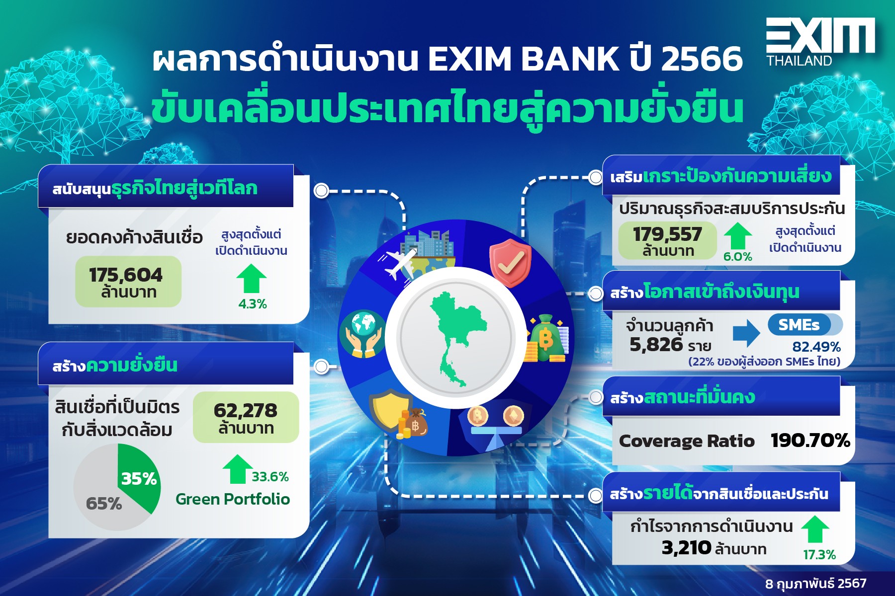 การมุ่งสนับสนุนผู้ประกอบการทั้งด้านสินเชื่อและประกันของ EXIM BANK ส่งผลให้ ณ สิ้นเดือนธันวาคม 2566 มีจำนวนลูกค้า 5,826 ราย เป็นลูกค้า SMEs 82.49% คิดเป็น 22% ของผู้ส่งออก SMEs ไทย นอกจากนี้ EXIM BANK ยังสนับสนุนผู้ประกอบการอย่างครบวงจร ผ่านการบ่มเพาะ ให้ความรู้ จับคู่ทางธุรกิจ และให้คำปรึกษาทางการเงิน โดย ณ สิ้นปี 2566 EXIM BANK ได้ส่งเสริมศักยภาพผู้ประกอบการสะสมกว่า 19,100 ราย สะท้อนการอยู่เคียงข้าง SMEs ไม่ทิ้งคนตัวเล็ก ดูแลช่วยเหลือกลุ่มเปราะบางเพื่อสนับสนุนให้ผู้ประกอบการไทยแข่งขันได้ในเวทีโลกยุคใหม่ภายใต้มาตรฐานการค้าโลกและกฎระเบียบที่เข้มงวดขึ้น