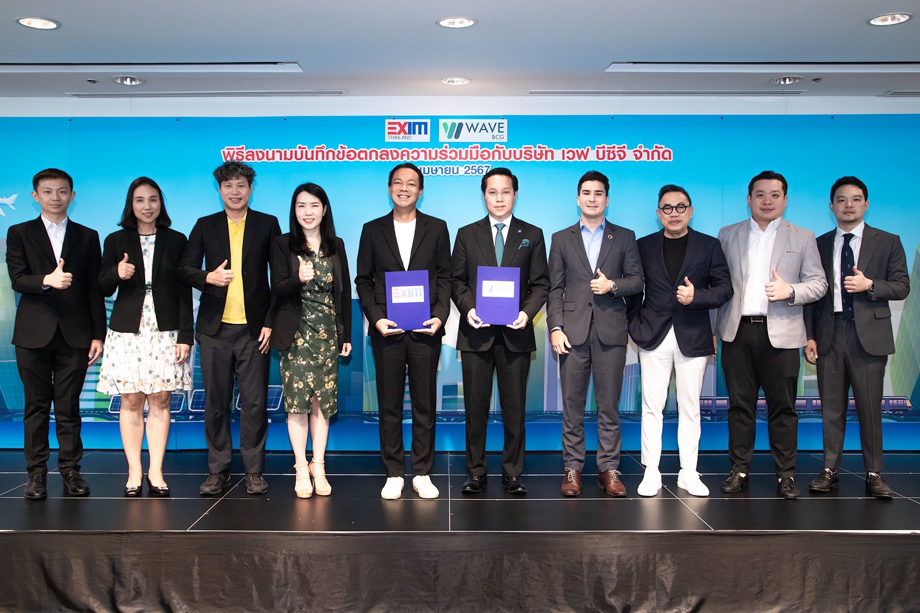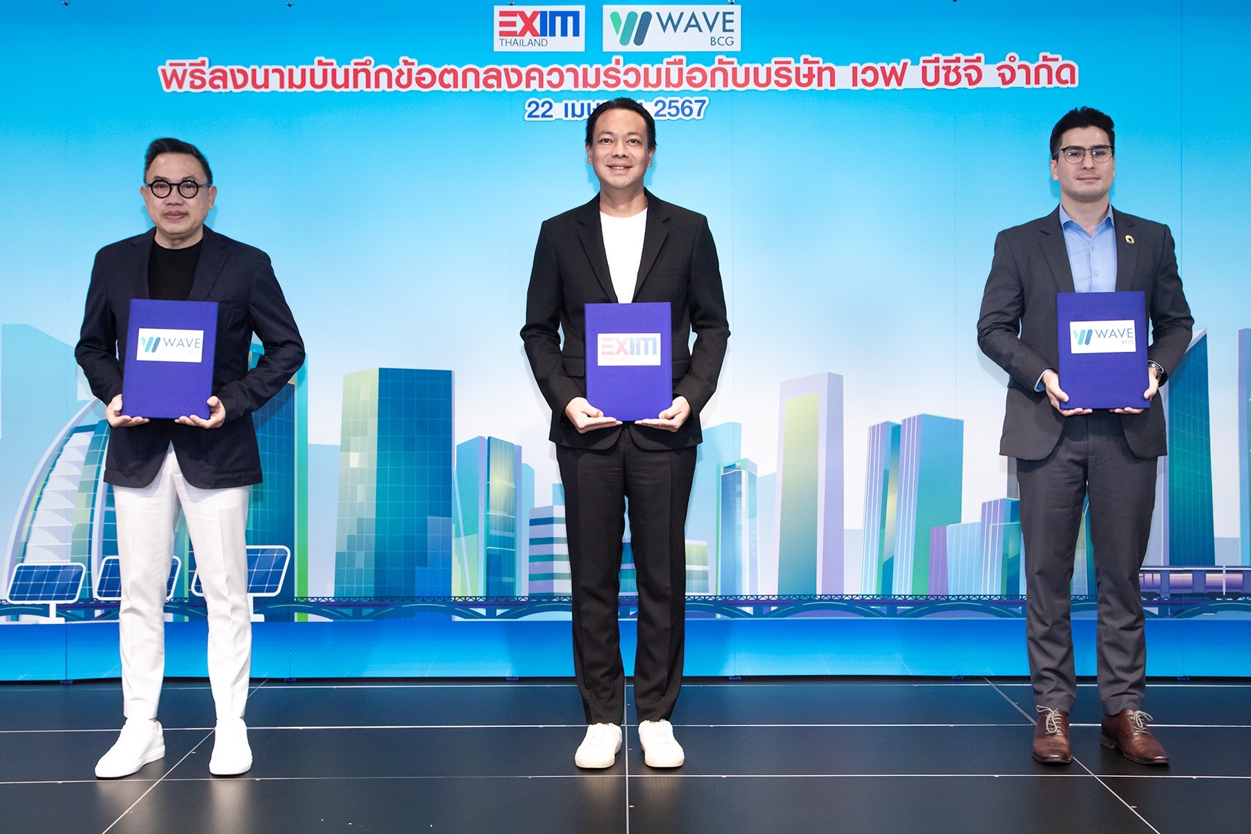 ดร.รักษ์ วรกิจโภคาทร กรรมการผู้จัดการ ธนาคารเพื่อการส่งออกและนำเข้าแห่งประเทศไทย (EXIM BANK) และนายเจมส์ แอนดริว มอร์ ประธานเจ้าหน้าที่บริหาร บริษัท เวฟ บีซีจี จำกัด ลงนามในบันทึกข้อตกลงความร่วมมือเพื่อสนับสนุนให้องค์กรต่าง ๆ รวมทั้งภาคธุรกิจของไทย บรรลุเป้าหมายการลดการปล่อยก๊าซเรือนกระจก โดยใช้กลไกใบรับรองการผลิตไฟฟ้าพลังงานหมุนเวียน (Renewable Energy Certificates : RECs) และคาร์บอนเครดิต รวมทั้งส่งเสริมการใช้ทรัพยากรร่วมกันและแบ่งปันความรู้ เพื่อยกระดับประสิทธิภาพองค์กรและการพัฒนาอย่างยั่งยืนในระดับองค์กร ประเทศชาติ และโลกโดยรวม ณ EXIM BANK สำนักงานใหญ่ เมื่อวันที่ 22 เมษายน 2567
