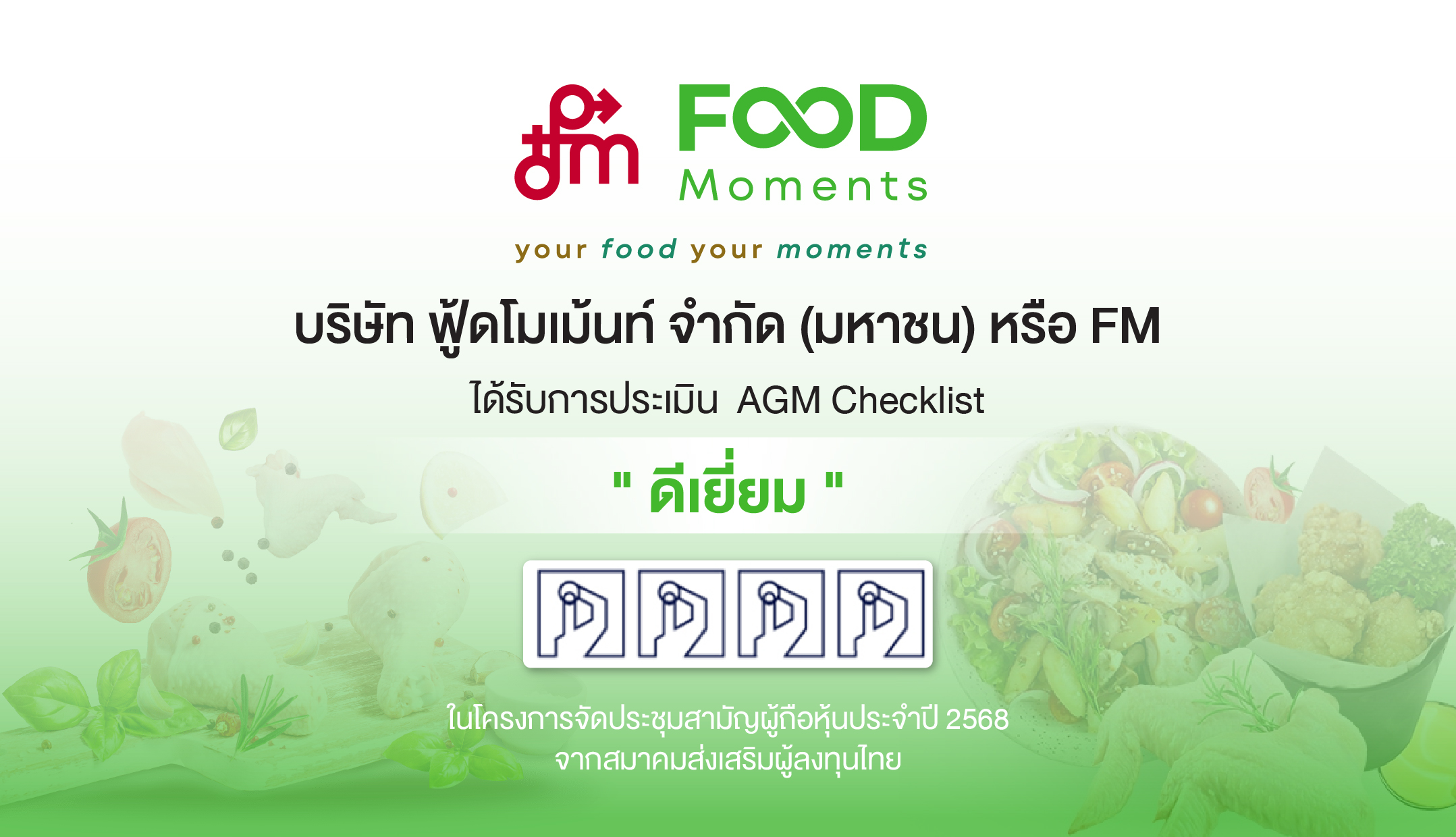 นายสุเมธ มาลิลีรังสี ประธานเจ้าหน้าที่ฝ่ายการเงิน บริษัท ฟู้ดโมเม้นท์ จำกัด (มหาชน) หรือ FM เปิดเผยว่า บริษัทฯ ภาคภูมิใจที่ได้รับการประเมินในระดับ “ดีเยี่ยม” (4 เหรียญ) ด้วยคะแนนสูงถึง 95 คะแนน อยู่ในเกณฑ์การประเมินระดับ 4 เหรียญ ซึ่งอยู่ในช่วงคะแนน 90–99 คะแนน ตามโครงการประเมินคุณภาพการจัดประชุมสามัญผู้ถือหุ้น (AGM Checklist) ประจำปี 2568 โดยสมาคมส่งเสริมผู้ลงทุนไทย ร่วมกับ สภาธุรกิจตลาดทุนไทย ถือเป็นผลสะท้อนที่ชัดเจนถึงความตั้งใจของบริษัทในการดำเนินธุรกิจอย่างโปร่งใส และคำนึงถึงสิทธิของผู้ถือหุ้นเป็นสำคัญ