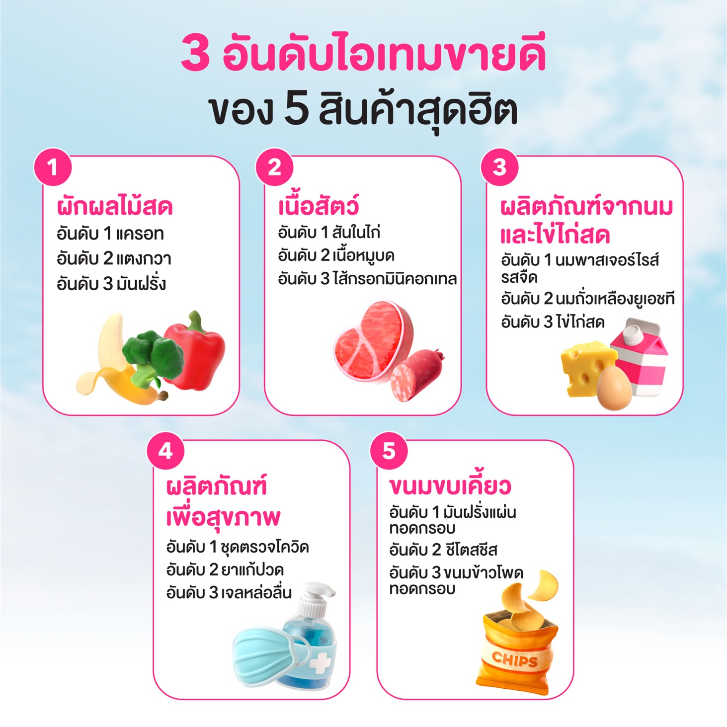 สิ่งที่น่าสนใจจากสถิติการสั่งสินค้าใน pandamart ตลอด 9 เดือนที่ผ่านมาก็คือ “ของสด” ที่ยังคงครองแชมป์สินค้าที่มียอดสั่งมากที่สุด ใน 5 หมวดหมู่ยอดนิยม สินค้าในกลุ่มของสดมีทั้งหมวดหมู่ “ผักผลไม้สด” “เนื้อสัตว์” และ “ผลิตภัณฑ์จากนมและไข่ไก่สด” โดยพฤติกรรมของลูกค้าในการสั่งซื้อของสดแบบเดลิเวอรี่ มีทั้งสั่งเพื่อใช้ประกอบอาหารในมื้อนั้น ๆ และซื้อติดตู้เย็นเอาไว้กินยามหิว เมื่อสังเกตจากพฤติกรรมผู้บริโภคจะเห็นว่าสินค้าในกลุ่มของสดยังมีโอกาสเติบโตต่อไปอีกมาก โดยเฉพาะในหมวดหมู่ “ผลิตภัณฑ์จากนมและไข่ไก่สด” มียอดสั่งซื้อสูงสุดในสินค้ากลุ่มของสด ซึ่งมีสินค้าขายดี 3 อันดับแรก คือ “นมพาสเจอร์ไรส์รสจืด” “นมถั่วเหลืองยูเอชที และไข่ไก่สด” รวมแล้วกว่า 60,000 รายการ (ในช่วงไตรมาส 1-3) ตามมาด้วยหมวดหมู่ “ผักผลไม้สด” ซึ่งมีสินค้าขายดี 3 อันดับแรก คือ “แครอท” “แตงกวา” และ “มันฝรั่ง” สำหรับหมวดหมู่ “เนื้อสัตว์” ที่ได้รับความนิยมเป็นอันดับ 3 ในกลุ่มของสด มีสินค้าขายดี 3 อันดับแรก คือ สันในไก่สด หมูบด และไส้กรอกมินิคอกเทล