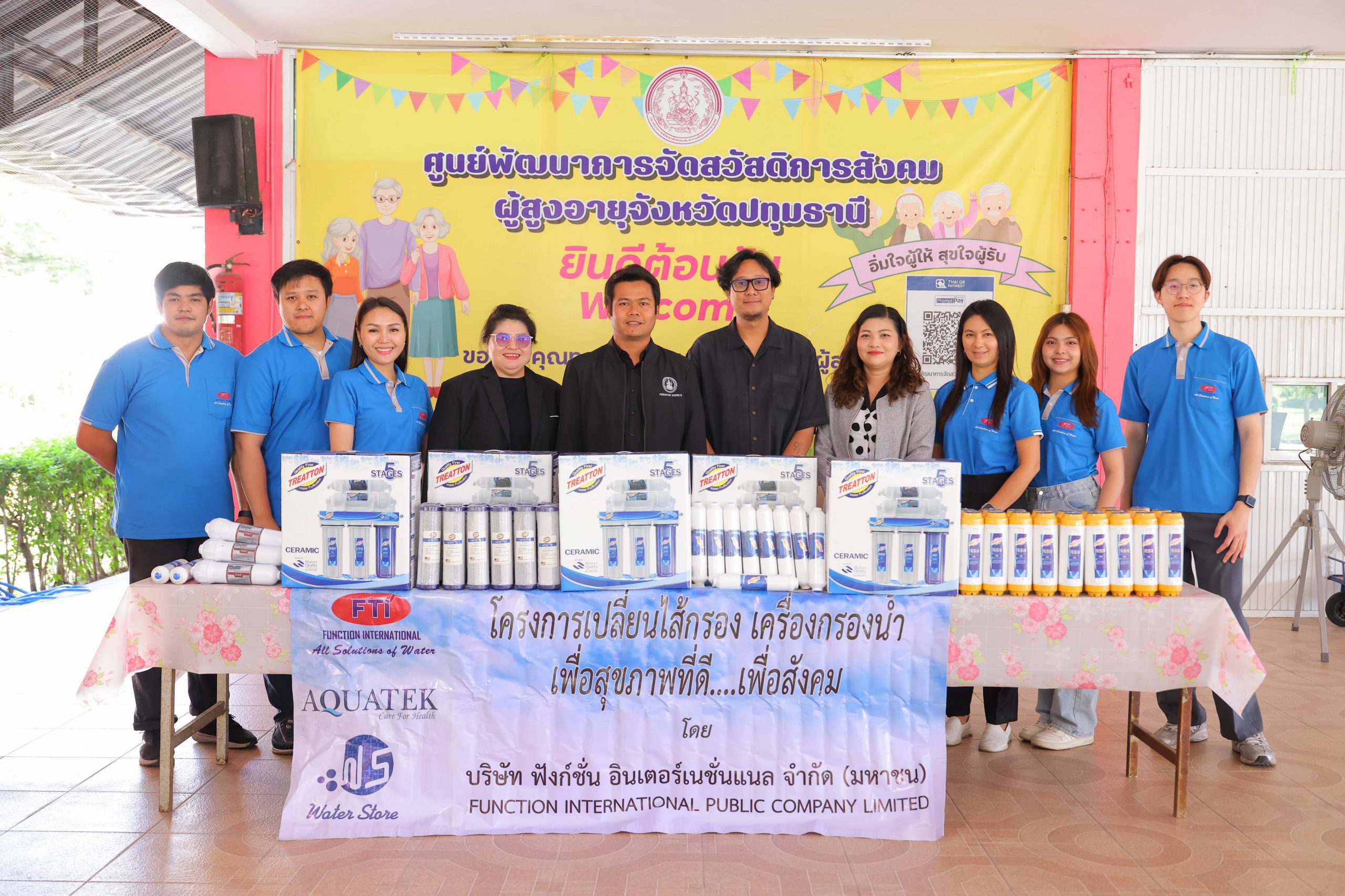ทีมการตลาดและประชาสัมพันธ์ บริษัท ฟังก์ชั่น อินเตอร์เนชั่นแนล จำกัด (มหาชน) หรือ FTI พร้อมด้วยทีมงาน ลงพื้นที่เปลี่ยนชุดเครื่องกรองน้ำดื่ม เพื่อยกระดับมาตรฐานน้ำดื่มให้สะอาด ปลอดภัย และเพียงพอต่อการใช้งานของผู้พักอาศัยในศูนย์ฯ ณ ศูนย์พัฒนาการจัดสวัสดิการสังคมผู้สูงอายุจังหวัดปทุมธานี