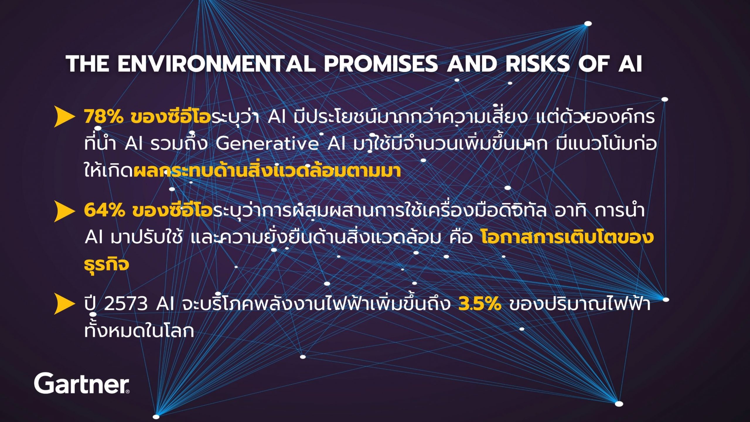 แม้ว่า 78% ของ CEO จะระบุว่าประโยชน์ของ AI นั้นมีมากกว่าความเสี่ยง แต่ด้วยจำนวนองค์กรที่นำ AI มาใช้เพิ่มขึ้น รวมถึงการใช้งาน Generative AI (GenAI) กำลังนำไปสู่ผลกระทบด้านสิ่งแวดล้อมเพิ่มตามมา การ์ทเนอร์คาดการณ์ว่า AI จะบริโภคพลังงานไฟฟ้าเพิ่มขึ้นถึง 3.5% ของปริมาณไฟฟ้าในโลกภายในปี พ.ศ.2573