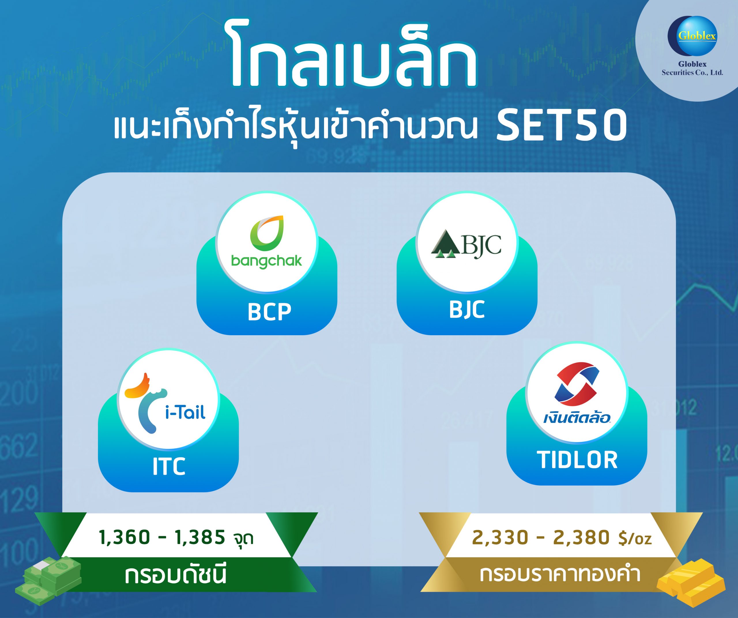 บล. โกลเบล็ก ประเมินหุ้นไทยสัปดาห์นี้ยังคง Sideway ลุ้นมาตรการกระตุ้นเศรษฐกิจรอบใหม่ๆ พร้อมจับตาท่าทีเฟดกำหนดทิศทางดอกเบี้ยนโยบาย จึงให้กรอบดัชนีที่ 1,360–1,385 จุด แนะกลยุทธ์ลงทุนในหุ้นเข้าคำนวณ SET50 ได้แก่ BCP-BJC-ITC-TIDLOR