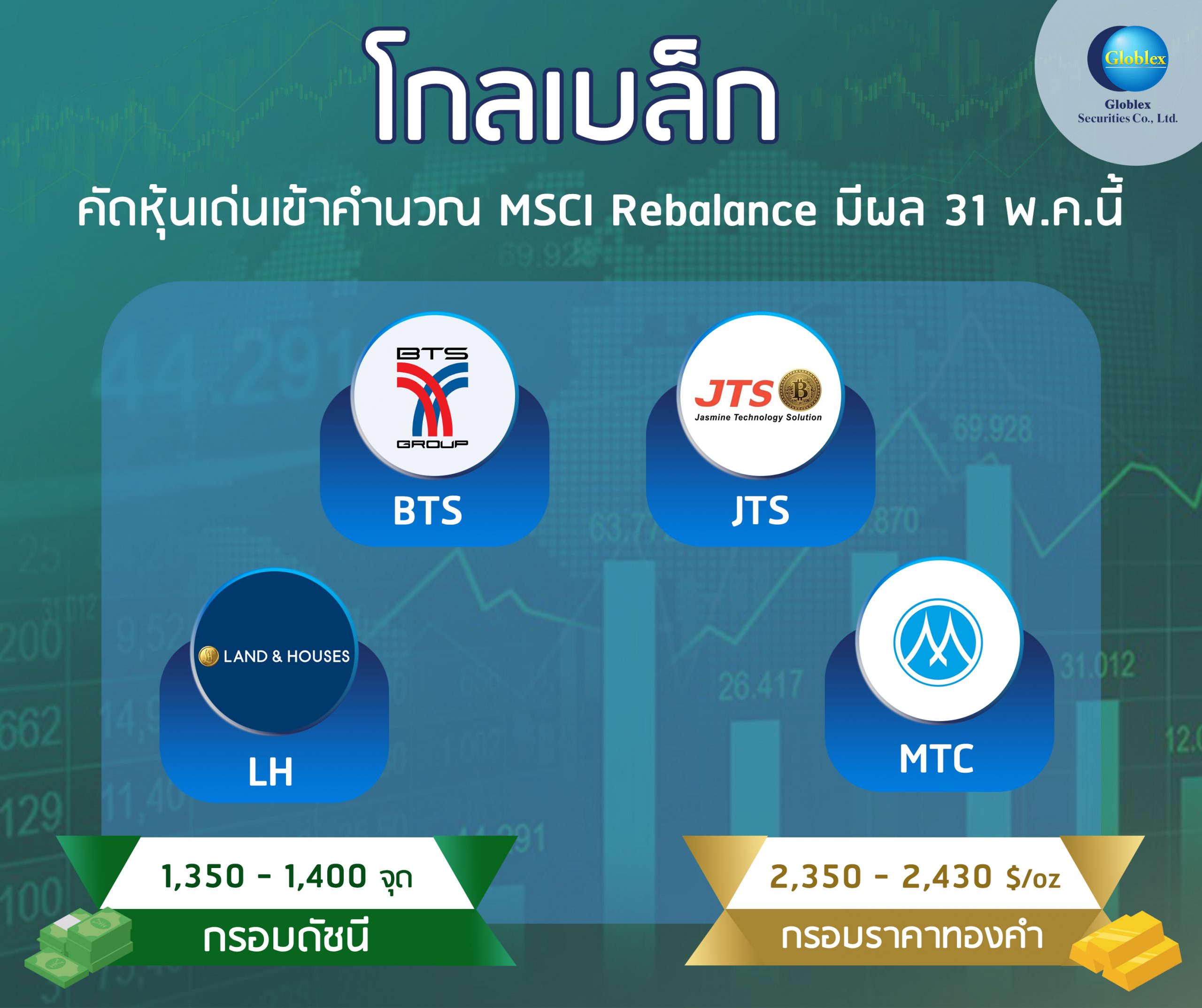 บล. โกลเบล็ก (GBS) ประเมินหุ้นไทยสัปดาห์นี้ยังคง Sideway ลุ้น Fed มีโอกาส 68% ลดอัตราดอกเบี้ยครั้งแรกในรอบการประชุม ก.ย.นี้ ขณะที่ในประเทศยังขาดปัจจัยใหม่หนุน จึงให้กรอบดัชนีที่ 1,350-1,400 จุด แนะกลยุทธ์ลงทุนในหุ้นเข้าคำนวณ MSCI Rebalance มีผล 31 พ.ค.นี้ ได้แก่ BTS, JTS, LH, MTC