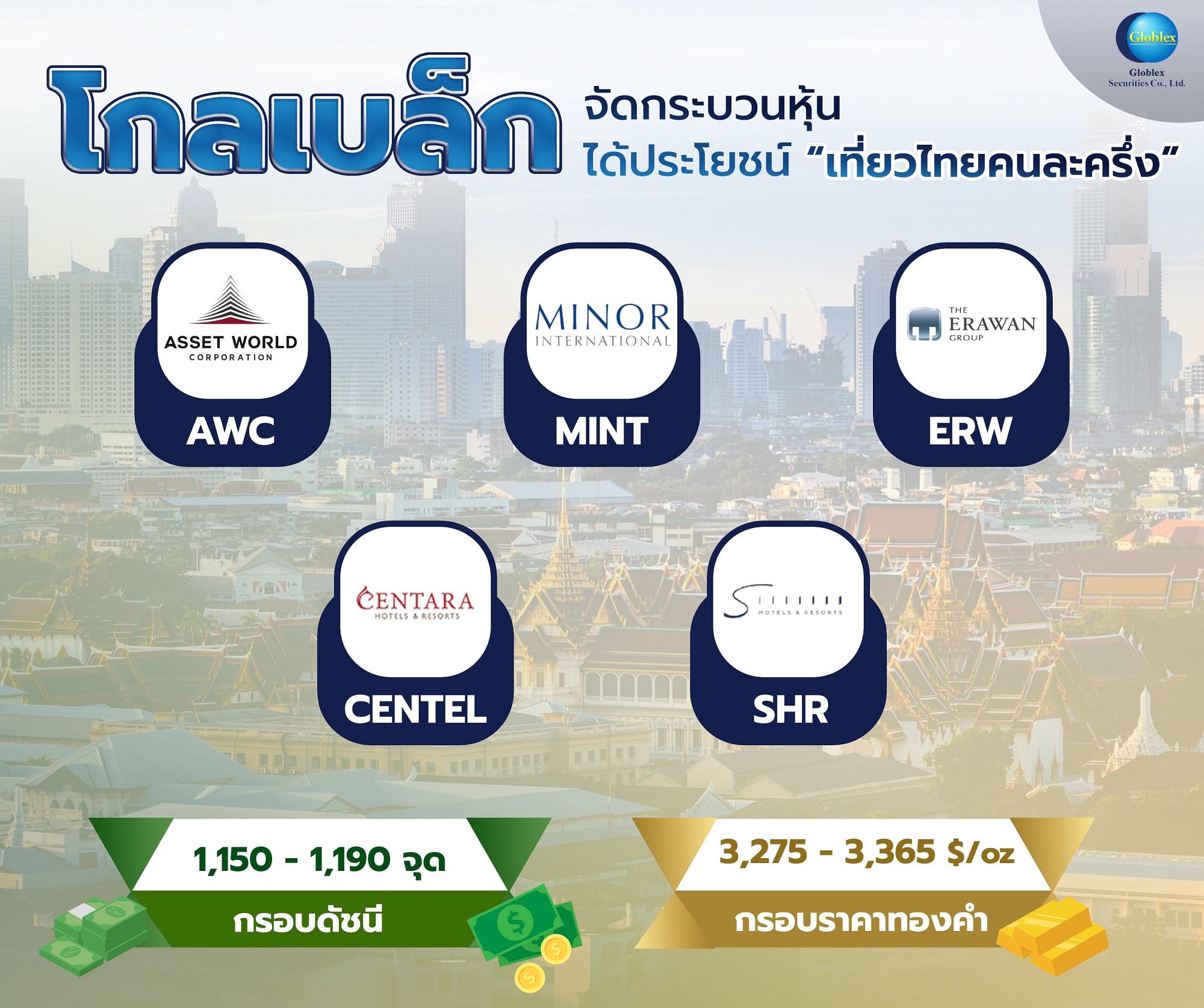 บล. โกลเบล็ก ประเมินหุ้นไทยสัปดาห์นี้ผันผวนต่อเนื่อง จากแรงกดดันความไม่แน่นอนของนโยบายภาษีการค้าของสหรัฐ หลัง ทรัมป์ ประกาศรีดภาษี 30% จากการนำเข้าสินค้าจากสหภาพยุโรป-เม็กซิโก มีผลบังคับ 1 ส.ค.นี้  จึงให้กรอบดัชนี 1,150-1,190 จุด แนะกลยุทธ์ลงทุนในหุ้นที่ได้ประโยชน์จากโครงการเที่ยวไทยคนละครึ่ง ชู AWC-MINT-ERW-CENTEL-SHR น่าลงทุน