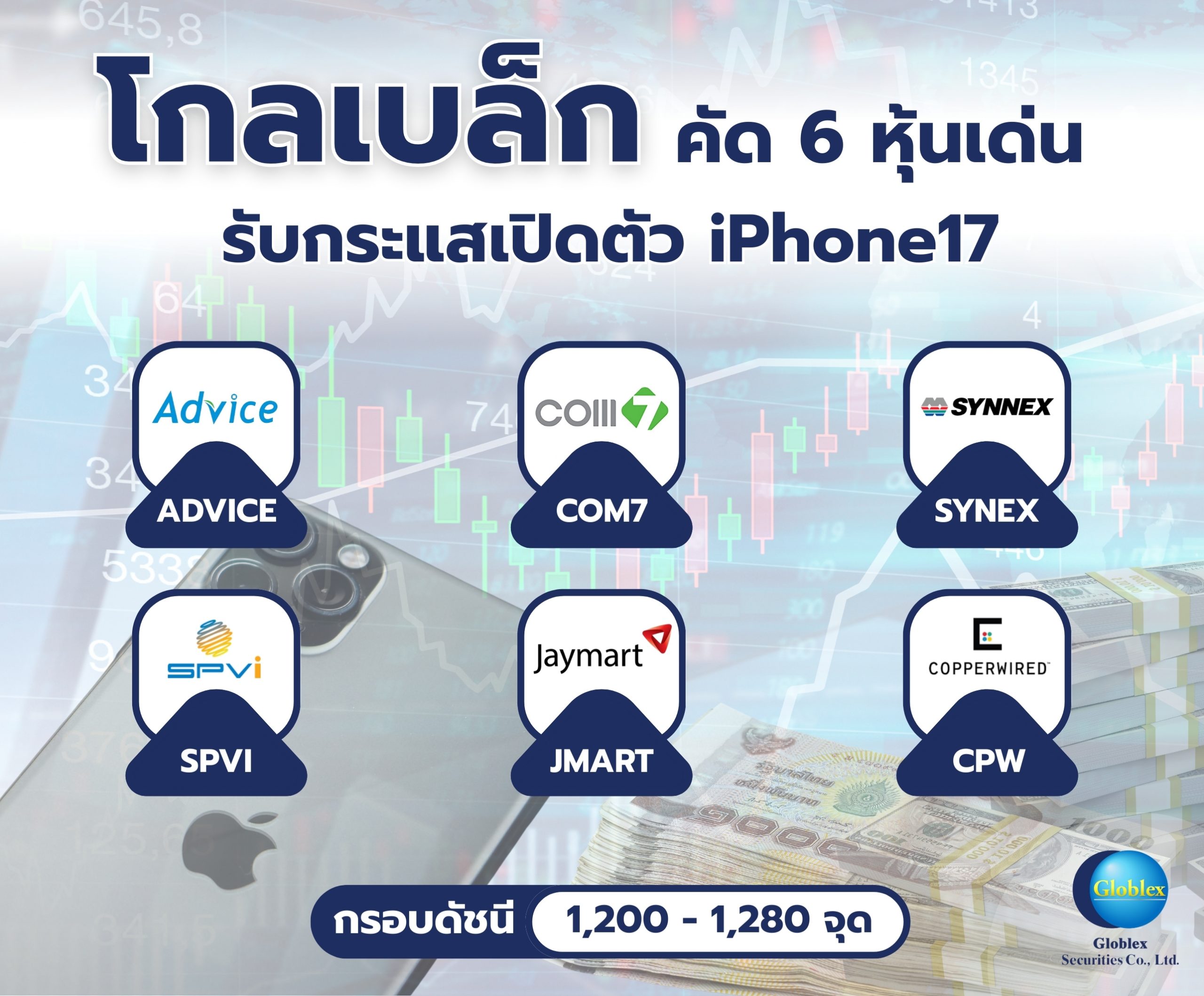 นายวัชเรนทร์ จงยรรยง ผู้อำนวยการฝ่ายวิจัย บล.โกลเบล็ก แนะนำกลยุทธ์สำหรับเดือนกันยายนลงทุนในหุ้นที่ได้ประโยชน์จากการเปิดตัว iPhone 17 ที่มีกระแสข่าวว่าจะเปิดตัวในวันที่ 9 ก.ย.นี้ ส่งผลให้หุ้นกลุ่มค้าปลีกและจัดจำหน่ายสินค้าไอทีได้รับอานิสงส์โดยตรง ได้แก่ ADVICE, COM7, SYNEX, SPVI, JMART และ CPW