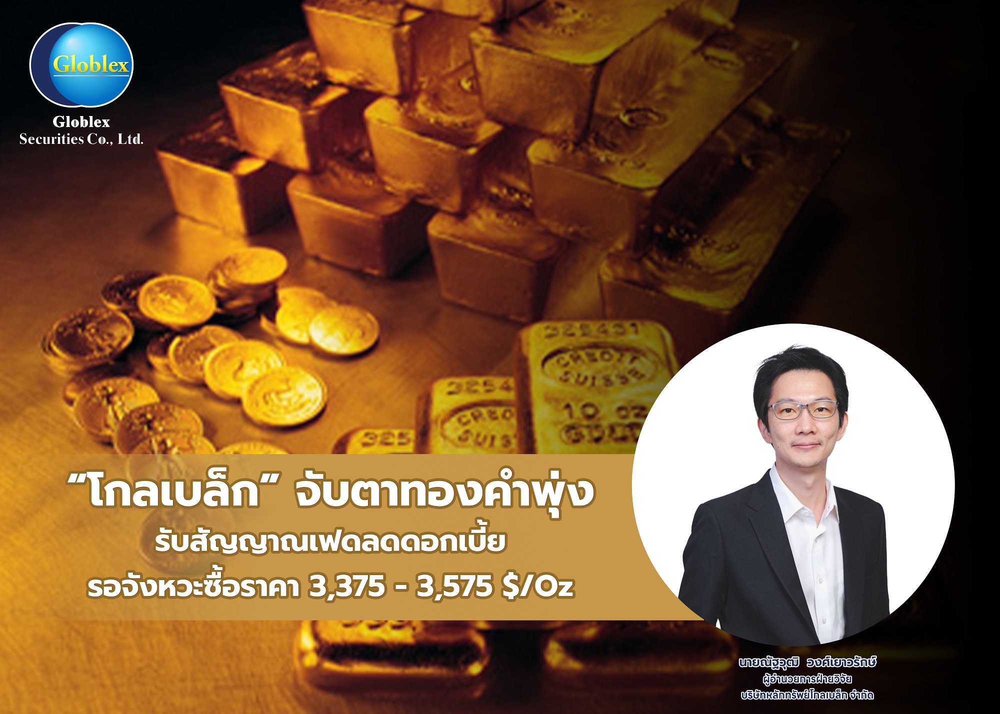 บล. โกลเบล็กประเมินราคาทองมีแนวโน้มปรับตัวขึ้น รับแรงหนุนจากปัจจัย เฟด ส่งสัญญาณลดดอกเบี้ยในการประชุมเดือนกันยายน และตุลาคมนี้ จากความไม่แน่นอนทางเศรษฐกิจโลก ให้รอจังหวะซื้อที่กรอบทองคำ 3,375-3,575 $/Oz
