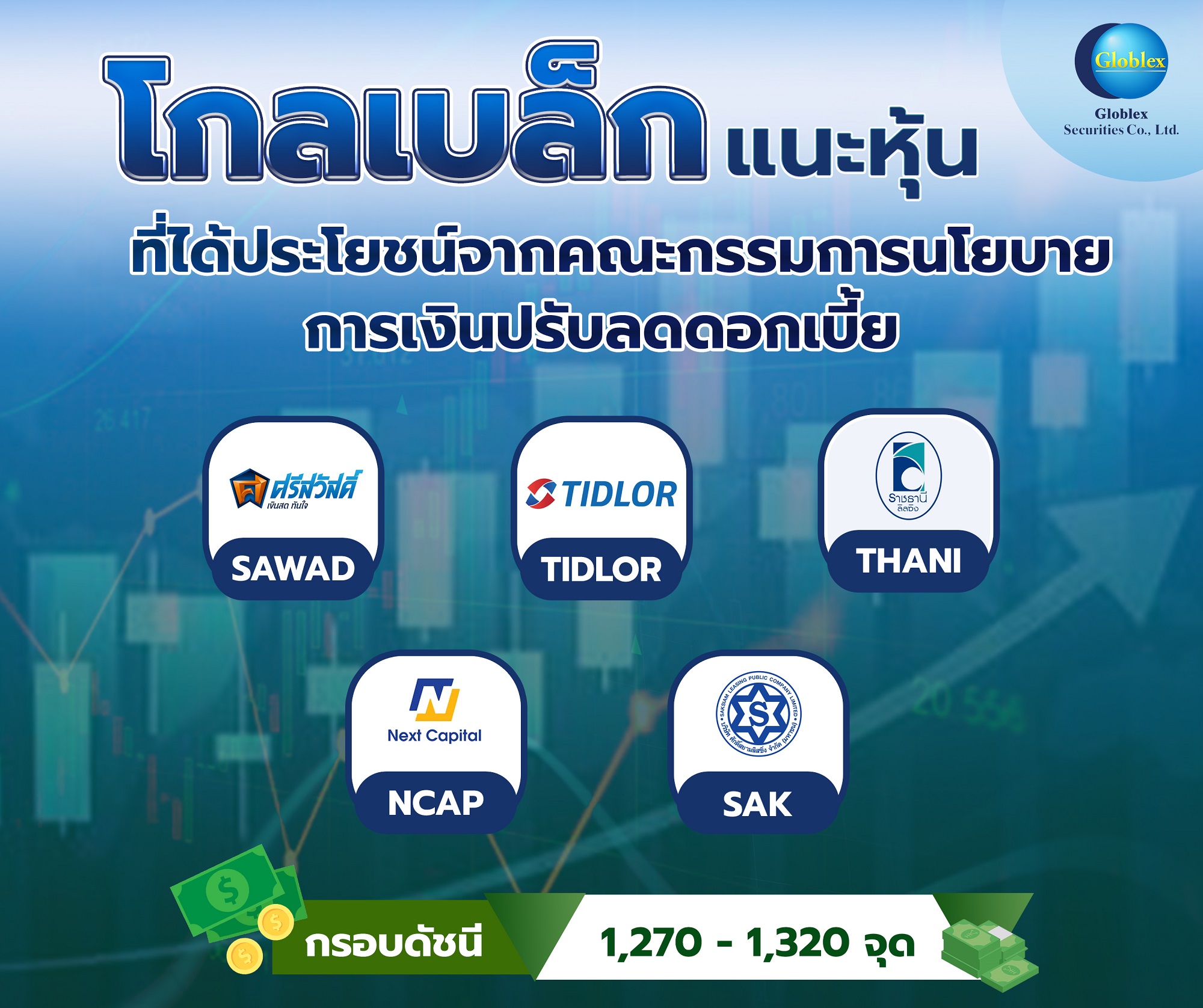 นายวัชเรนทร์ จงยรรยง ผู้อำนวยการฝ่ายวิจัย บล.โกลเบล็ก แนะนำกลยุทธ์การลงทุนในหุ้นที่ได้ประโยชน์จากคณะกรรมการนโยบายการเงิน (กนง.) ปรับลดดอกเบี้ย ได้แก่ SAWAD, TIDLOR, THANI, NCAP และ SAK