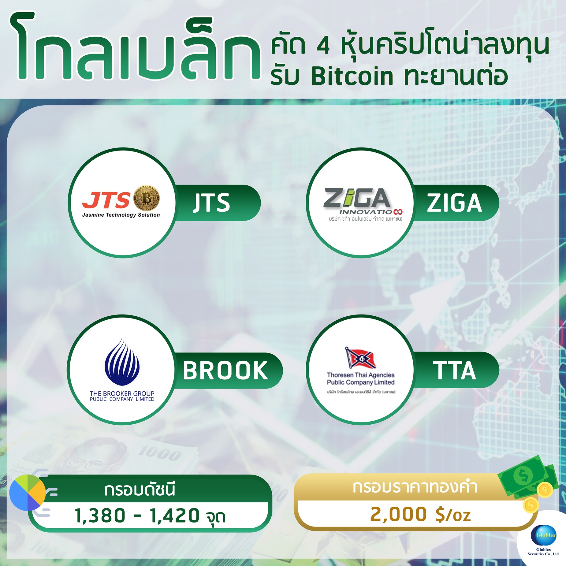 บล. โกลเบล็ก ประเมินหุ้นไทยสัปดาห์นี้แกว่งตัว Sideway ออกข้าง จับตาการแจ้งงบของบจ.งวดปี 66 วันที่ 29 ก.พ.เป็นวันสุดท้าย และการรายงานดัชนี PCE สัปดาห์นี้ จึงให้กรอบดัชนีที่ 1,380-1,420 จุด แนะกลยุทธ์ลงทุนในหุ้นได้ประโยชน์จากการปรับตัวต่อเนื่องของ Bitcoin ได้แก่ JTS-ZIGA-BROOK-TTA
