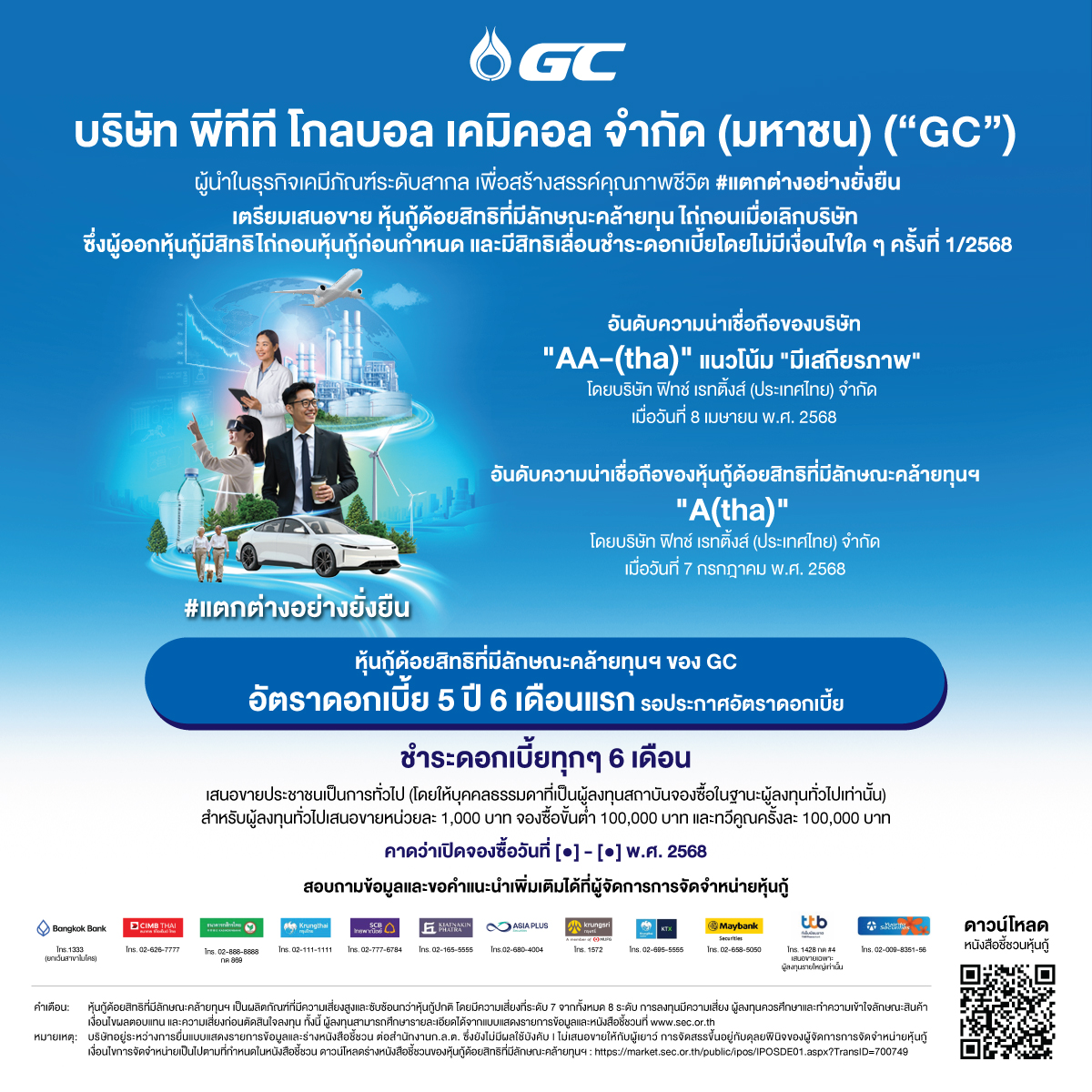 บริษัท พีทีที โกลบอล เคมิคอล จำกัด (มหาชน) ประกาศเตรียมออกและเสนอขายหุ้นกู้ด้อยสิทธิที่มีลักษณะคล้ายทุนฯ สกุลเงินบาท ชุดใหม่ ซึ่งคาดว่าจะเสนอขายต่อผู้ลงทุนทั่วไป (Public Offering) ในช่วงปลายปี 2568 โดยเป็นส่วนหนึ่งของแผนลดภาระทางการเงิน (Deleveraging Program) ที่ดำเนินการอย่างต่อเนื่องตั้งแต่ปี 2567–2568 เพื่อเสริมความแข็งแกร่งของโครงสร้างเงินทุนในระยะยาว เพิ่มความยืดหยุ่นทางการเงิน รวมถึงรองรับความท้าทายจากสภาวะเศรษฐกิจโลกและปัจจัยภูมิรัฐศาสตร์ พร้อมขับเคลื่อน GC สู่การเติบโตของธุรกิจมูลค่าสูง-คาร์บอนต่ำอย่างยั่งยืน