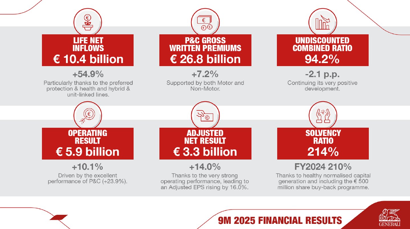 โดยในช่วง 9 เดือนของปี 2025 ผ่านมา เจนเนอราลี่ กรุ๊ป สามารถสร้างการเติบโตอย่างต่อเนื่องเมื่อเทียบกับช่วงเดียวกันของปีก่อน โดยมี เบี้ยประกันภัยรับรวม (Gross Written Premium) อยู่ที่ประมาณ 2.79 ล้านล้านบาท (73.1 พันล้านยูโร) เพิ่มขึ้น 3.7% ขณะที่ ธุรกิจประกันชีวิต (Life Net Inflow) มียอดเงินไหลเข้าสุทธิ อยู่ที่ประมาณ 3.96 แสนล้านบาท (10.4 พันล้านยูโร) ด้านธุรกิจบริหารสินทรัพย์และความมั่งคั่ง (Asset & Wealth Management) ที่ยังคงเติบโตในทิศทางบวก อยู่ที่ 32.16 พันล้านบาท (843 ล้านยูโร) เพิ่มขึ้น 0.7% ส่งผลให้ผลการดำเนินงาน (Operating Result) เพิ่มขึ้นอย่างมีนัยสำคัญเป็น 2.27 แสนล้านบาท (5.9 พันล้านยูโร) เพิ่มขึ้น 10.1% จากผลการดำเนินงานที่แข็งแกร่งของธุรกิจประกันวินาศภัย (P&C) และการสนับสนุนในเชิงบวกจากทุกกลุ่มธุรกิจทำให้มีกำไรสุทธิที่ปรับปรุงแล้ว (Adjusted Net Result) อยู่ที่ประมาณ 1.25 แสนล้านบาท (3.3 พันล้านยูโร) เพิ่มขึ้น 14 %) ขณะที่กำไรต่อหุ้นที่ปรับปรุงแล้ว (Adjusted EPS) เพิ่มขึ้นเป็น 82.41 บาทต่อหุ้น (2.16 ยูโรต่อหุ้น) เพิ่มขึ้น 19% สะท้อนถึงศักยภาพในการสร้างผลตอบแทนที่มั่นคงและต่อเนื่องให้กับผู้ถือหุ้น