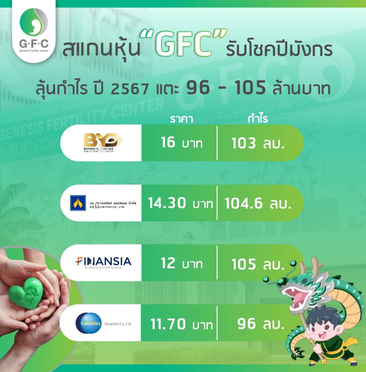 บริษัทหลักทรัพย์ เอเอสแอล จำกัด ประมาณการกำไรสุทธิของ GFC ในปี 2566-2568 เท่า 70.2 ล้านบาท , 104.6 ล้านบาท และ115.5 ล้านบาท ตามลำดับ โดยคิดเป็นอัตราการเติบโต เท่ากับ 6.8%, 49.1% และ 10.4% ตามลำดับ หรือ28.3% CAGR และได้ประมาณการรายได้เท่ากับ 340 ล้านบาท , 480 ล้านบาท และ 520 ล้านบาท ตามลำดับ คิดเป็นอัตราการเติบโตเท่ากับ 23.2%, 41.2% และ 8.3% ตามลำดับ หรือ 23.7% CAGR ตามแนวโน้มการเข้ารับการรักษาเพิ่มขึ้นของจำนวนผู้มีบุตรยาก ตามแผนการขยายสาขา และการให้บริการแก่ลูกค้าต่างชาติ โดยให้มูลค่าที่เหมาะสมปี 2567 เท่ากับ 14.30 บาท อิง PE เท่ากับ 30 เท่าใกล้เคียงกับค่าเฉลี่ย PE ระยะยาวของหุ้นกลุ่มโรงพยาบาล โดยมองว่าแนวโน้มของผลประกอบการยังคงเติบโตต่อเนื่อง