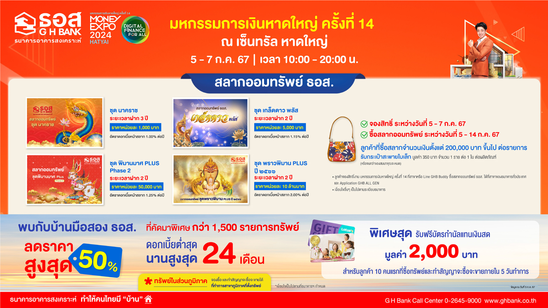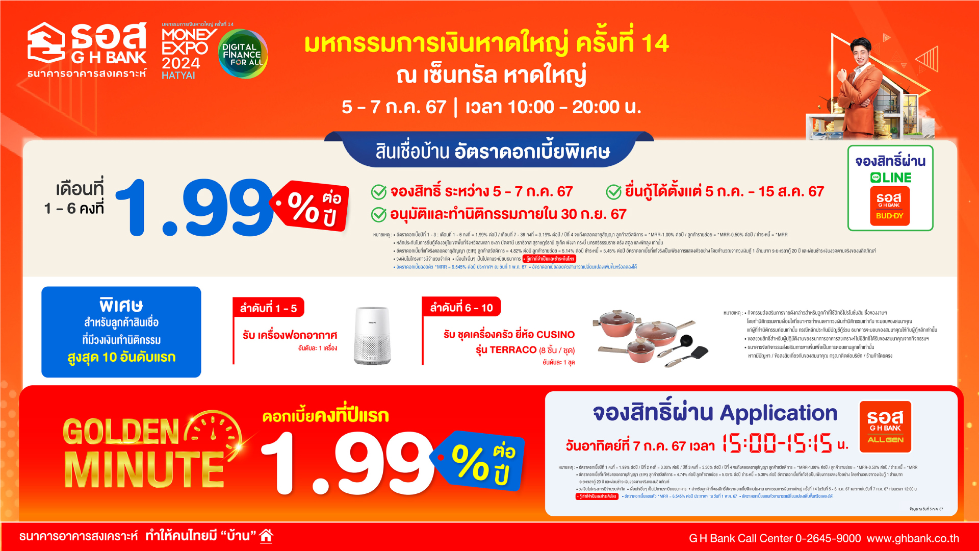 ธนาคารอาคารสงเคราะห์ (ธอส.) ในฐานะสถาบันการเงินของรัฐ ที่มีพันธกิจ “ทำให้คนไทยมีบ้าน” พร้อมสนับสนุนให้คนไทยมีที่อยู่อาศัยเป็นของตนเองมากขึ้น ด้วยการจัดโปรโมชันพิเศษร่วมงาน “มหกรรมการเงินหาดใหญ่ ครั้งที่ 14 Money Expo 2024 Hatyai” ระหว่างวันที่ 5-7 กรกฎาคม 2567 เพื่อเพิ่มโอกาสให้ชาวภาคใต้ ได้เข้าถึงผลิตภัณฑ์ทางการเงินของธนาคาร นำโดย (1) สินเชื่อบ้านอัตราดอกเบี้ยพิเศษ อัตราดอกเบี้ยเดือนที่ 1 – 6 เท่ากับ 1.99% ต่อปี เดือนที่ 7 – 36 เท่ากับ 3.19% ต่อปี (อัตราดอกเบี้ยเฉลี่ย 3 ปีแรกเท่ากับ 2.99% เท่านั้น) และปีที่ 4 จนถึงตลอดอายุสัญญา กรณีลูกค้าสวัสดิการ เท่ากับ MRR-1.00% ต่อปี, ลูกค้ารายย่อย เท่ากับ MRR-0.50% ต่อปี และการกู้ชำระหนี้เกี่ยวกับที่อยู่อาศัย เท่ากับ MRR (อัตราดอกเบี้ย MRR ธอส. ปัจจุบัน เท่ากับ 6.545% ต่อปี) ผ่อนชำระนานสูงสุดถึง 40 ปี ให้กู้ครอบคลุมทุกวัตถุประสงค์หลัก อาทิ ซื้อบ้าน/คอนโดมิเนียม ปลูกสร้าง ต่อเติม ซ่อมแซม รีไฟแนนซ์ และชำระหนี้เกี่ยวกับที่อยู่อาศัย (หลักประกันในการยื่นกู้ต้องอยู่ในเขตพื้นที่จังหวัดในภาคใต้ตอนล่าง และภาคตะวันตก) โดยสามารถจองสิทธิ์ผ่าน Line GHB Buddy ยื่นคำขอกู้ได้ตั้งแต่วันที่ 5 กรกฎาคม – 15 สิงหาคม 2567 และทำนิติกรรมภายในวันที่ 30 กันยายน 2567 โดยผู้กู้จะได้สิทธิ์ค่าประเมินราคาหลักประกันอัตราพิเศษอีกด้วย และพิเศษสุดสำหรับลูกค้าภายในงานเท่านั้น!! ช่วง Golden Minute อัตราดอกเบี้ยต่ำ โดยเปิดจองสิทธิ์ผ่าน Mobile Application : GHB ALL GEN ในวันอาทิตย์ที่ 7 กรกฎาคม 2567 ระหว่างเวลา 15.00 – 15.15 น. จองก่อนได้ก่อน กรอบวงเงินจำกัดและเงื่อนไขตามที่ธนาคารกำหนด พิเศษ! สำหรับลูกค้าที่มีวงเงินทำนิติกรรมสูงสุด 10 อันดับแรก รับของสมนาคุณฟรีมากมาย!! โดยลำดับที่ 1 – 5 รับเครื่องฟอกอากาศ 1 เครื่อง (อันดับละ 1 สิทธิ์), ลำดับที่ 6 – 10 รับชุดเครื่องครัว ยี่ห้อ CUSINOรุ่น TERRACO (8 ชิ้น/ชุด) จำนวน 1 ชุด (ลำดับละ 1 สิทธิ์)