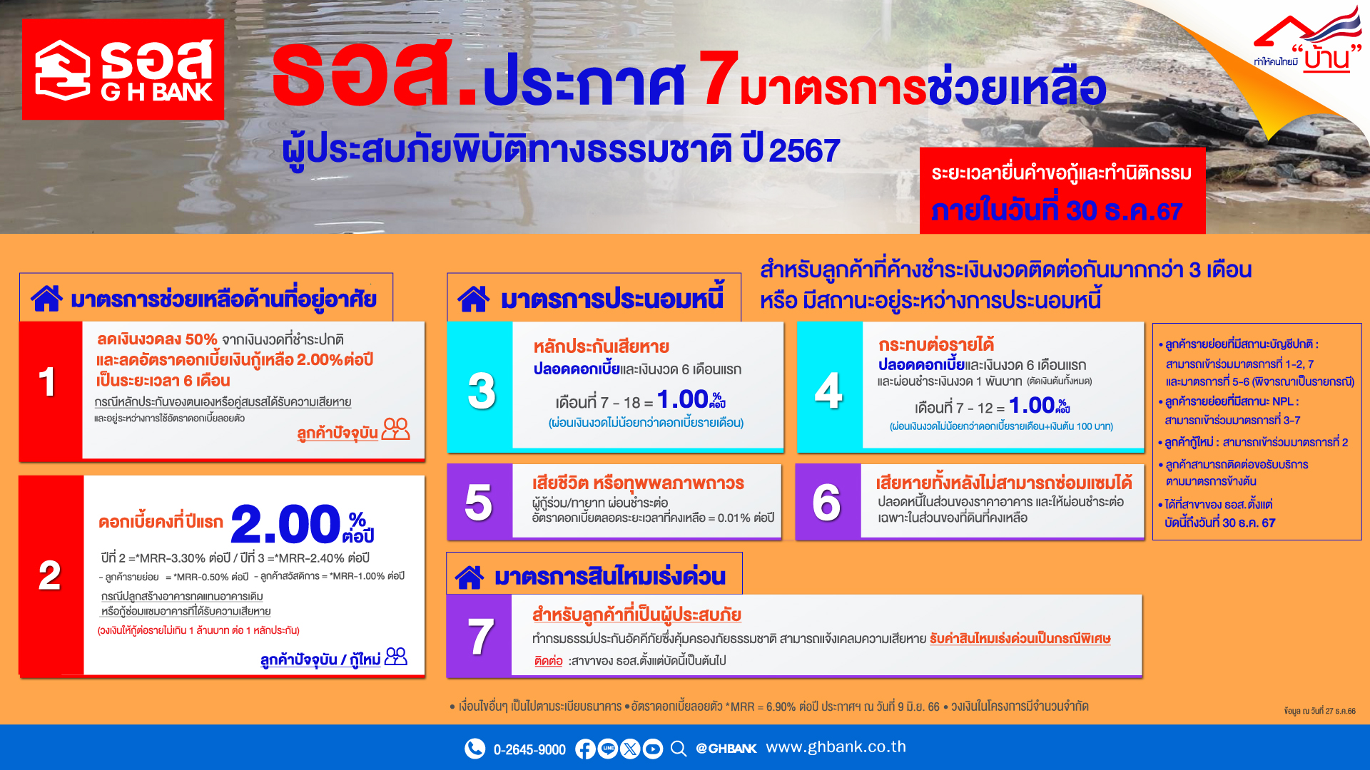 มาตรการที่ 7 พิจารณาสินไหมเร่งด่วน (Fast Track) 20,000  1 2562 30,000 สำหรับลูกค้าที่ทำกรมธรรม์ประกันอัคคีภัยที่อยู่อาศัยซึ่งคุ้มครองภัยธรรมชาติกับบริษัทประกันภัยที่ธนาคารจัดให้ พิจารณาจ่ายค่าสินไหมให้กับลูกค้าที่ประสบภัยทุกรายอย่างเร่งด่วนเป็นกรณีพิเศษ โดยผู้เอาประกันสามารถแจ้งความเสียหายโดยใช้ภาพถ่าย จ่ายตามความเสียหายจริงไม่เกิน บาทและสำหรับลูกค้าที่มีกรมธรรม์เริ่มความคุ้มครองตั้งแต่วันที่ พฤศจิกายน เพิ่มความคุ้มครองภัยธรรมชาติตามความเสียหายจริงอีกไม่เกิน บาท ต่อปี (รายละเอียดและเงื่อนไขเป็นไปตามกรมธรรม์)