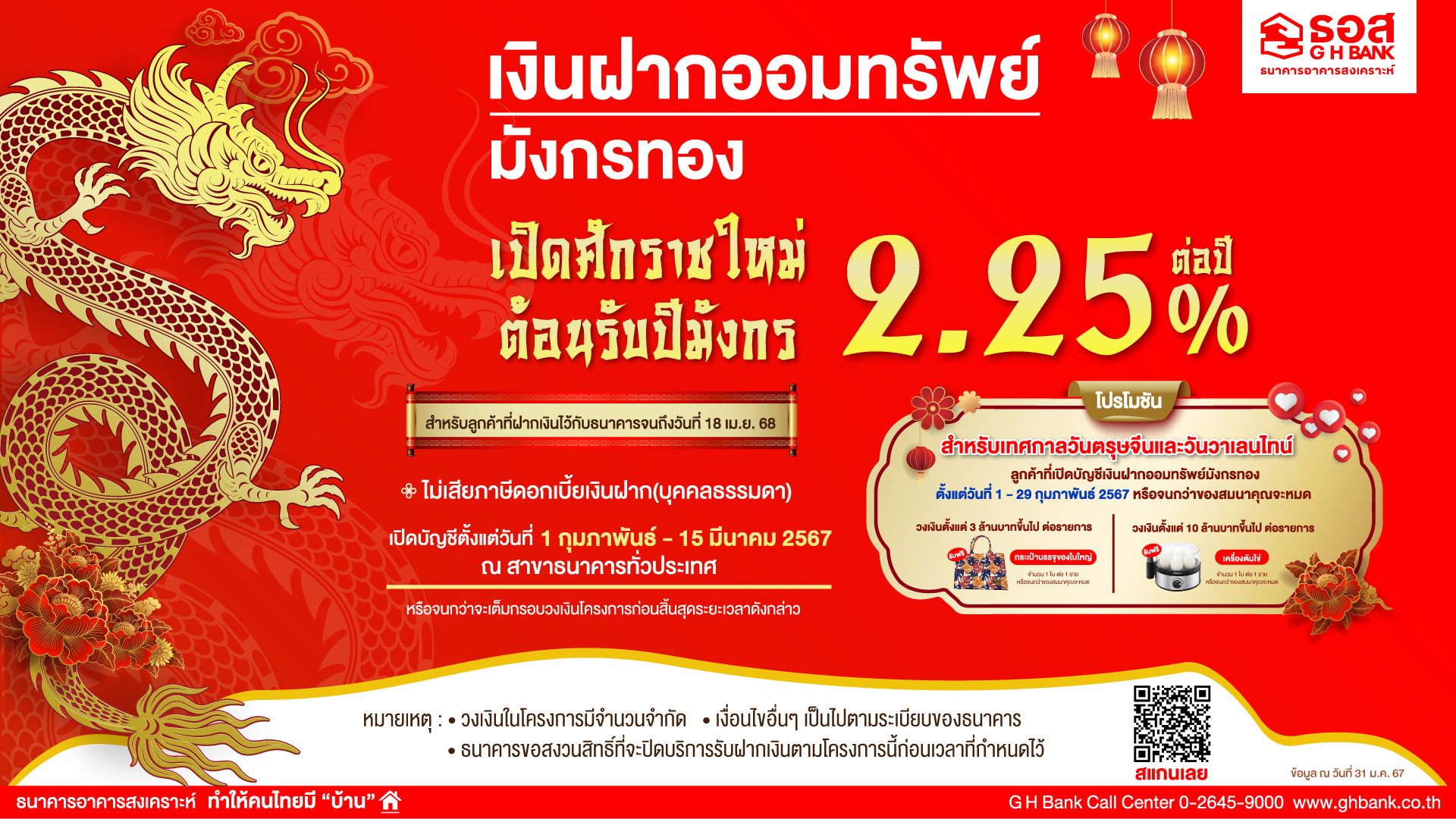 ธนาคารอาคารสงเคราะห์ (ธอส.) สถาบันการเงินของรัฐ ที่มีพันธกิจ “ทำให้คนไทยมีบ้าน” ต้อนรับเทศกาลวันตรุษจีนและวันวาเลนไทน์ในปี 2567 ด้วยการเพิ่มทางเลือกให้กับผู้รักการออม กับ “เงินฝากออมทรัพย์ มังกรทอง” ที่ให้อัตราดอกเบี้ยสูงถึง 2.25% ต่อปี (สำหรับลูกค้าที่ฝากเงินจนถึงวันที่ 18 เมษายน 2568) เพียงเปิดบัญชีเงินฝากตั้งแต่ 10,000 บาทขึ้นไป ที่สาขาธนาคารทั่วประเทศ ระหว่างวันที่ 1 กุมภาพันธ์ –15 มีนาคม 2567 หรือจนกว่าจะเต็มกรอบวงเงิน โดยลูกค้าจะได้รับดอกเบี้ยเงินฝากปีละ 2 ครั้ง (วันที่ 29 มิถุนายน และ วันที่ 29 ธันวาคม) และพิเศษต่อที่ 1 เปิดบัญชีระหว่างวันที่ 1-29 กุมภาพันธ์ 2567 วงเงินตั้งแต่ 3 ล้านบาทขึ้นไปต่อรายการ รับฟรี กระเป๋าบรรจุของใบใหญ่ 1 ใบ/1 ราย และวงเงินตั้งแต่ 10 ล้านบาทขึ้นไปต่อรายการ รับฟรี เครื่องต้มไข่ 1 เครื่อง/1 ราย พิเศษต่อที่ 2 สามารถฝากได้ไม่จำกัดวงเงิน บุคคลธรรมดาไม่เสียภาษีดอกเบี้ยเงินฝาก โดยผู้ที่สนใจสามารถเปิดบัญชีเงินฝากออมทรัพย์มังกรทองได้ที่สาขาธนาคารทั่วประเทศ