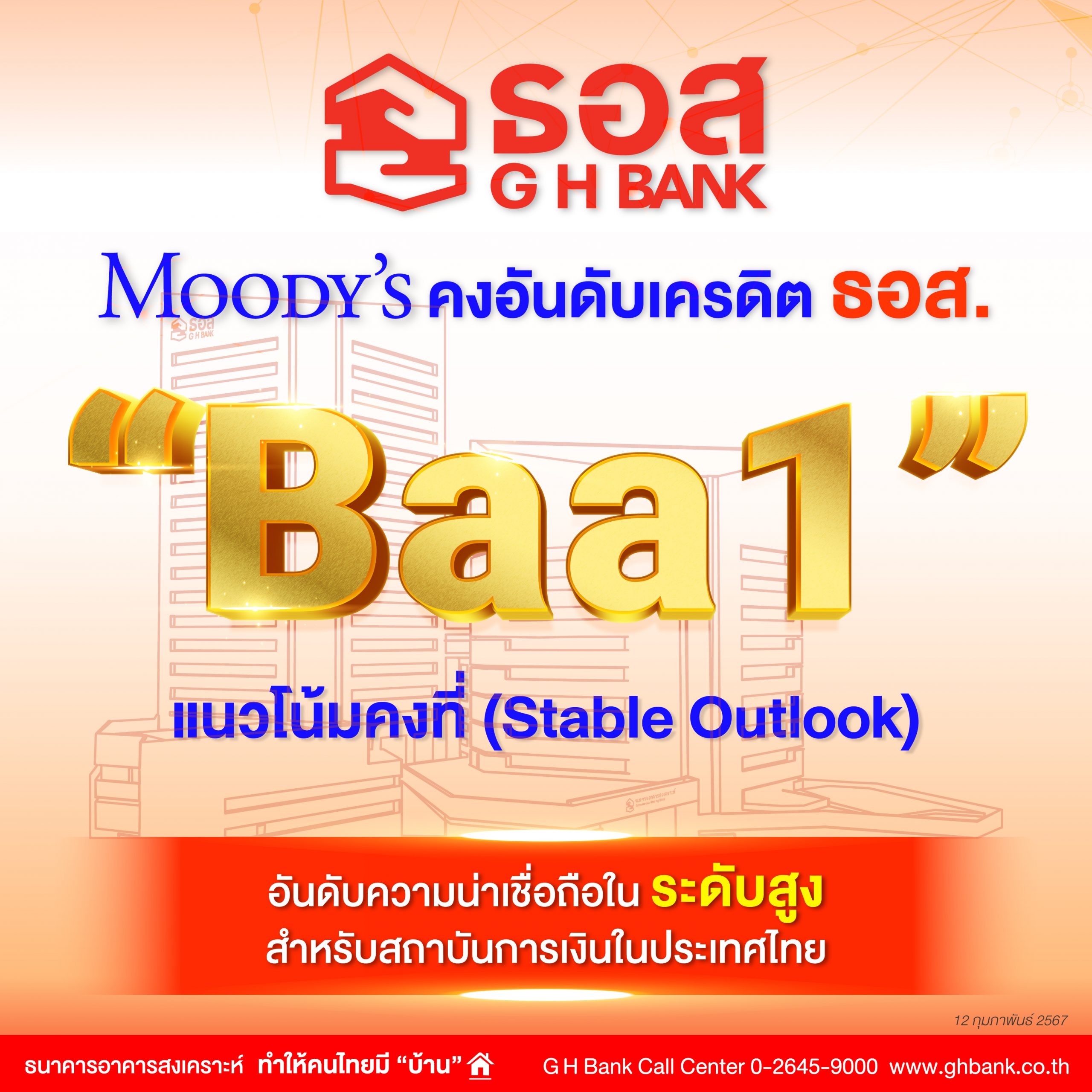 ธอส. เผย Moody’s Investors Service สถาบันการจัดอันดับเครดิตระดับสากล ประกาศคงอันดับเครดิตองค์กรของ ธอส. ในระดับ Baa1 และแนวโน้มอันดับเครดิตในระดับคงที่ (Stable) ถือเป็นอันดับความน่าเชื่อถือในระดับสูงสำหรับสถาบันการเงินในประเทศไทย สะท้อนความแข็งแกร่งทางการเงินของธนาคาร และบริหารจัดการ NPL ได้อย่างมีประสิทธิภาพ
