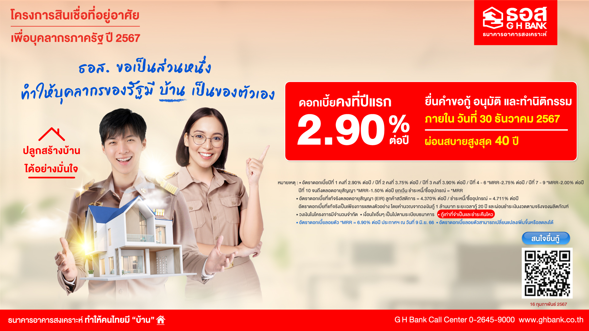 3.โครงการสินเชื่อที่อยู่อาศัยเพื่อบุคลากรภาครัฐ ปี 2567 กรอบวงเงิน 20,000 ล้านบาท สำหรับข้าราชการ พนักงานราชการ พนักงานมหาวิทยาลัย เจ้าหน้าที่ของรัฐ พนักงานรัฐวิสากิจ และลูกจ้างประจำ ที่ต้องการกู้เพื่อซื้อ ปลูกสร้าง ต่อเติม ซ่อมแซม ไถ่ถอนจากสถาบันการเงินอื่น (รีไฟแนนซ์) ชำระหนี้เกี่ยวกับที่อยู่อาศัย และเพื่อซื้ออุปกรณ์หรือสิ่งอำนวยความสะดวก อัตราดอกเบี้ยปีที่ 1 เท่ากับ 2.90% ต่อปี ปีที่ 2 เท่ากับ 3.75% ต่อปี ปีที่ 3 เท่ากับ 3.90% ต่อปี เฉลี่ย 3 ปีแรกเพียง 3.52% ต่อปี ปีที่ 4-6 เท่ากับ MRR-2.75% ต่อปี ปีที่ 7-9 เท่ากับ MRR-2.00% ต่อปี ปีที่ 10 จนถึงตลอดอายุสัญญา เท่ากับ MRR-1.50% ต่อปี ยกเว้น กรณีชำระหนี้/ซื้ออุปกรณ์ฯ เท่ากับ MRR กรณีกู้ 1 ล้านบาท ผ่อนชำระเริ่มต้นเพียง 5,500 บาทต่อเดือน ยื่นคำขอกู้และทำนิติกรรมภายในวันที่ 30 ธันวาคม 2567