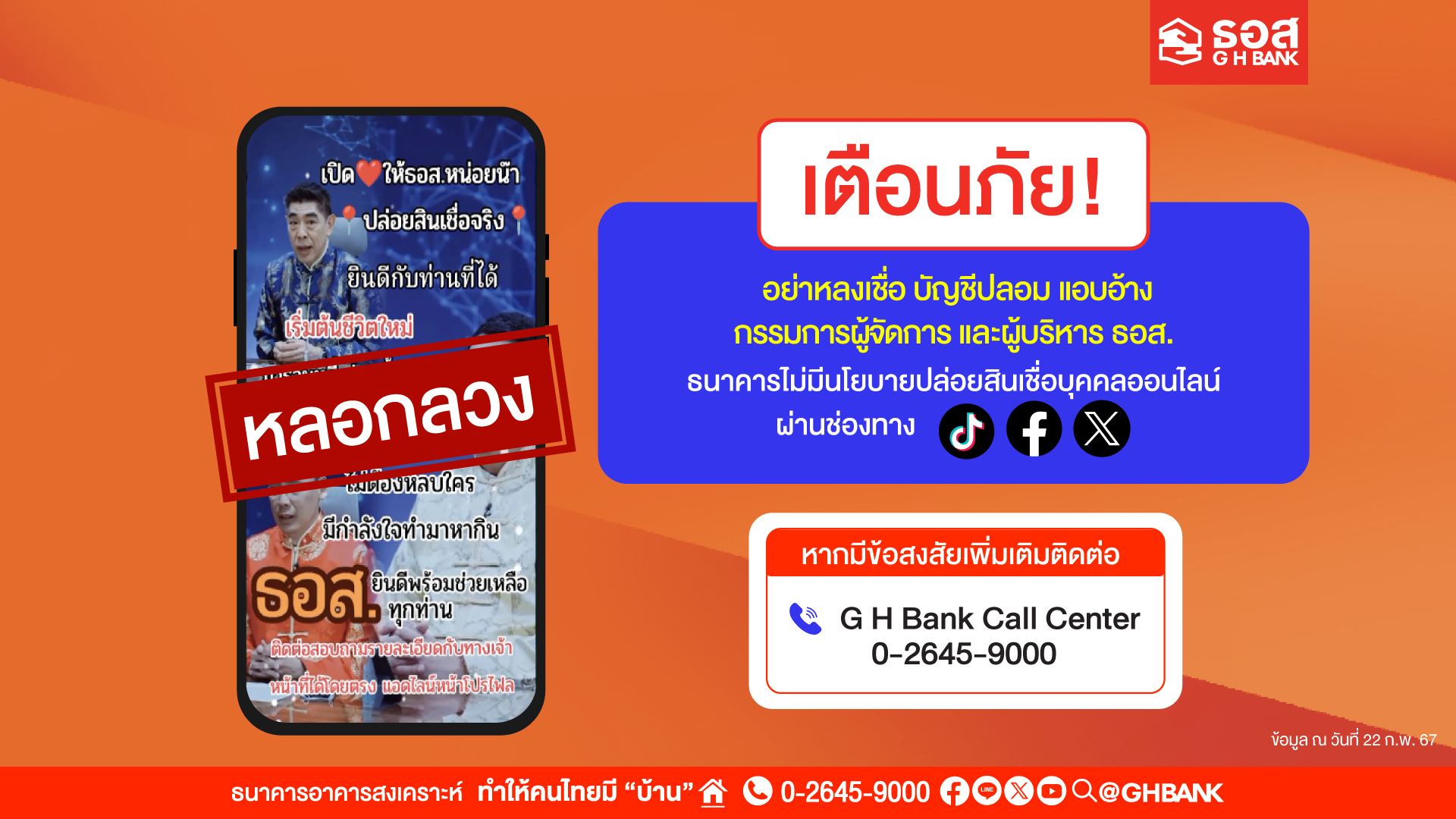 ธนาคารอาคารสงเคราะห์ (ธอส.) ขอแจ้งเตือนภัย กรณีมีมิจฉาชีพนำตราสัญลักษณ์ของธนาคารและปลอม Account ในสื่อโซเชียล โดยใช้ภาพของนายกมลภพ วีระพละ กรรมการผู้จัดการ ธอส. เพื่อแอบอ้างปล่อยสินเชื่อบุคคลออนไลน์จากธนาคาร โดย ธอส. ขอยืนยันว่า ธนาคารและกรรมการผู้จัดการ ไม่มีส่วนเกี่ยวข้องกับ Account ปลอมดังกล่าว รวมถึงการแอบอ้างในสื่อโซเชียลต่างๆ ที่อาจใช้รูปภาพและกระทำในลักษณะเดียวกัน เพื่อหลอกลวงเอาเงินจากประชาชน ซึ่ง ธอส.อยู่ระหว่างดำเนินการทางกฎหมายกับกลุ่มมิจฉาชีพที่แอบอ้างแล้ว และขอให้ประชาชนอย่าหลงเชื่อกลโกงของมิจฉาชีพอย่างเด็ดขาด พร้อมขอความร่วมมือไม่ส่งหรือแชร์ต่อในช่องทางสื่อสังคมออนไลน์ต่างๆ และเพื่อให้ประชาชนได้รับข้อมูลข่าวสารจากธนาคารอาคารสงเคราะห์ได้อย่างครบถ้วน สามารถติดตามได้ที่ www.ghbank.co.th หรือ G H Bank Call Center โทร 0-2645-9000 และ Facebook Fanpage ธนาคารอาคารสงเคราะห์