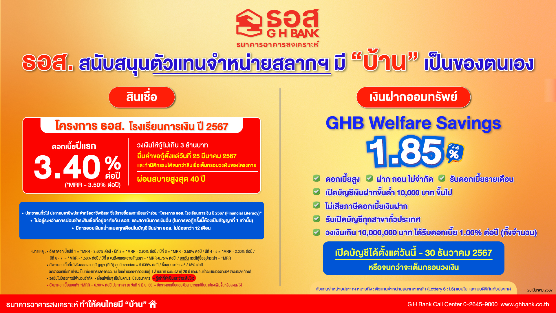 ธนาคารอาคารสงเคราะห์ (ธอส.) เดินหน้ายกระดับคุณภาพชีวิตตัวแทนจำหน่ายสลากกินแบ่งรัฐบาลจัดทำแพ็กเกจสินเชื่อและเงินฝากอัตราดอกเบี้ยพิเศษ สำหรับตัวแทนจำหน่ายสลากหกหลัก (Lottery 6 : L6) แบบใบ และแบบดิจิทัลทั่วประเทศ ให้มีที่อยู่อาศัยเป็นของตนเอง โดยผู้ที่สนใจสามารถใช้บริการผลิตภัณฑ์สินเชื่อของธนาคารในโครงการ ธอส. โรงเรียนการเงิน ปี 2567 วงเงินกู้รายละไม่เกิน 3 ล้านบาท อัตราดอกเบี้ยปีแรกเพียง 3.40% ต่อปี (MRR-3.50% ต่อปี) เฉลี่ย 3 ปีแรก 3.93% ต่อปี รวมถึงออมเงินกับเงินฝากออมทรัพย์ GHB Welfare Savings อัตราดอกเบี้ยสูงถึง 1.85% ต่อปี โดยตัวแทนจำหน่ายสลากฯ สามารถยื่นคำขอกู้ได้ตั้งแต่วันที่ 25 มีนาคม 2567 เป็นต้นไป และเปิดบัญชีเงินฝากได้ตั้งแต่วันนี้ถึงวันที่ 30 ธันวาคม 2567 หรือจนกว่าจะเต็มกรอบวงเงิน