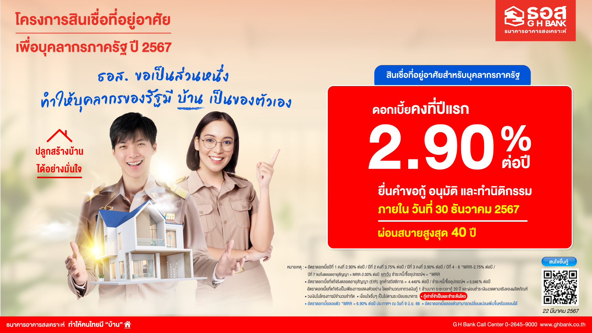 2.โครงการสินเชื่อที่อยู่อาศัยเพื่อบุคลากรภาครัฐ ปี 2567 กรอบวงเงิน 20,000 ล้านบาท สำหรับข้าราชการ พนักงานราชการ พนักงานมหาวิทยาลัย พนักงานรัฐวิสาหกิจ พนักงาน/เจ้าหน้าที่ของรัฐ และลูกจ้างประจำกู้เพื่อซื้อ ปลูกสร้าง ต่อเติม ซ่อมแซม ไถ่ถอนจากสถาบันการเงินอื่น (รีไฟแนนซ์) ชำระหนี้เกี่ยวกับที่อยู่อาศัยและเพื่อซื้ออุปกรณ์หรือสิ่งอำนวยความสะดวกที่เกี่ยวเนื่องเพื่อประโยชน์ในการอยู่อาศัย คิดอัตราดอกเบี้ย ปีที่ 1 เท่ากับ 2.90% ต่อปี ปีที่ 2 เท่ากับ 3.75% ต่อปี ปีที่ 3 เท่ากับ 3.90% ต่อปี เฉลี่ย 3 ปีแรก เท่ากับ 3.52% ปีที่ 4-6 เท่ากับ MRR-2.75% ต่อปี (4.15% ต่อปี) ปีที่ 7 จนถึงตลอดอายุสัญญา เท่ากับ MRR-2.00% ต่อปี กรณีซื้ออุปกรณ์ฯ/ชำระหนี้ เท่ากับ MRR โดยข้อมูล ณ วันที่ 20 มีนาคม 2567 มีลูกค้ายื่นขอสินเชื่อรวม 215 บัญชี คิดเป็นวงเงินยื่นขอสินเชื่อ 195 ล้านบาท ทำนิติกรรมแล้ว 89 บัญชี คิดเป็นวงเงินนิติกรรม 82.7 ล้านบาท