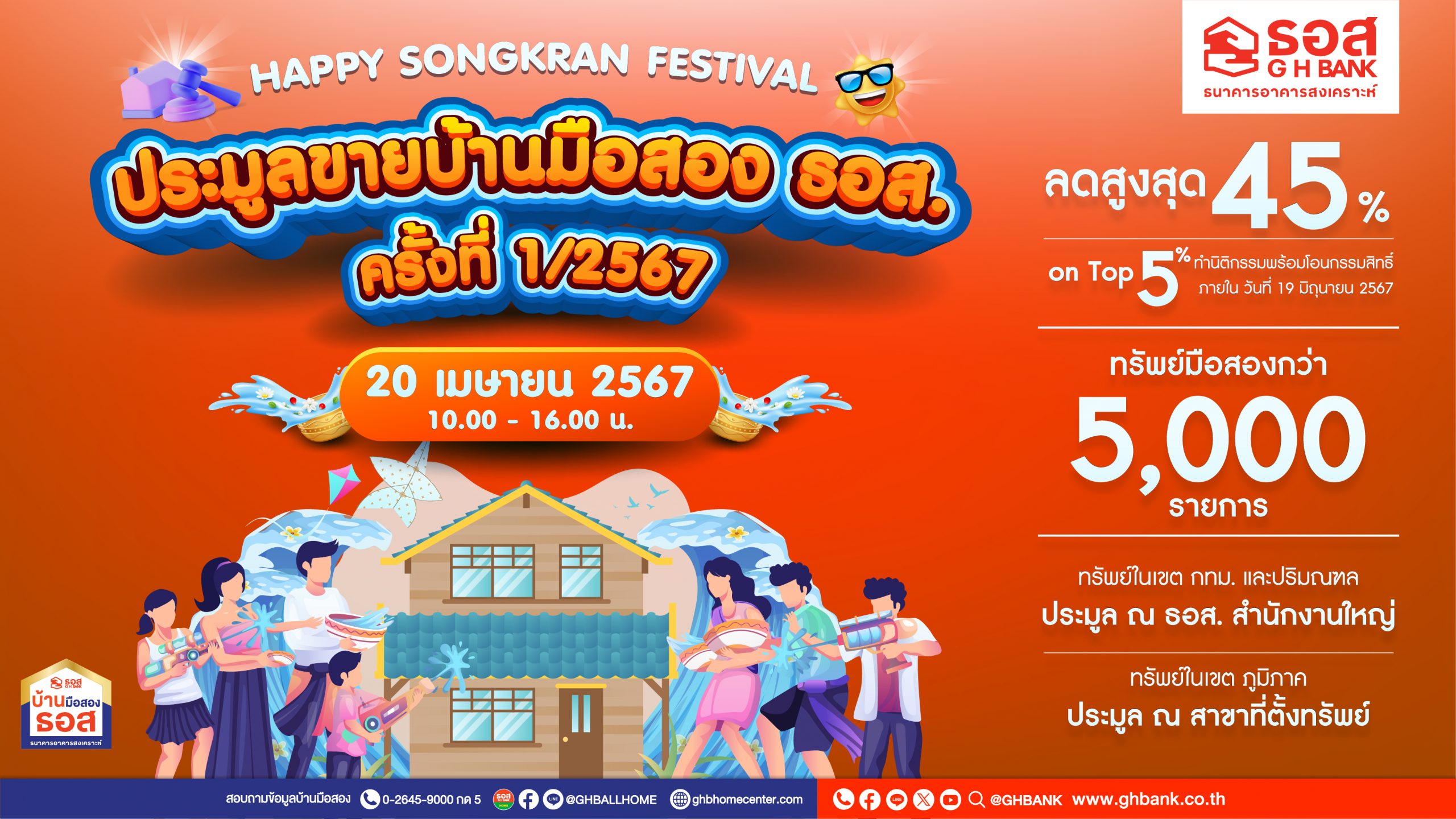 มีบ้านต้อนรับสงกรานต์กับ ธอส.!! ในงานประมูลขายบ้านมือสอง ครั้งที่ 1/2567 วันเสาร์ที่ 20 เม.ย.67 เวลา 10.00-16.00 น.
