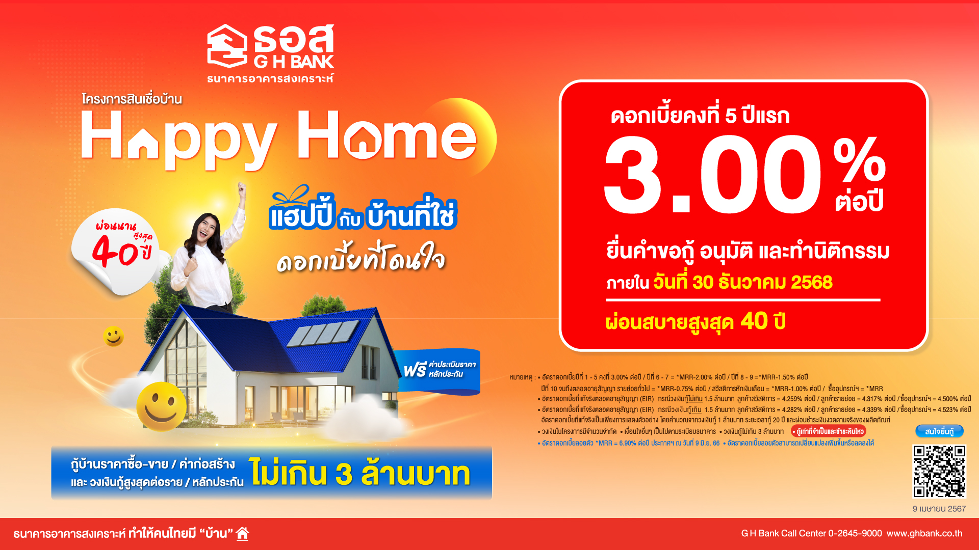 ที่ประชุมคณะรัฐมนตรี (ครม.) เห็นชอบให้ธนาคารอาคารสงเคราะห์ (ธอส.) ดำเนินการตามนโยบายรัฐบาล และกระทรวงการคลัง ในการสนับสนุนคนไทยให้มีที่อยู่อาศัยเป็นของตนเองและลดความเหลื่อมล้ำทางสังคมผ่านการผ่อนชำระเงินงวดที่เหมาะสมกับสินเชื่อเพื่อที่อยู่อาศัยอัตราดอกเบี้ยต่ำใน “โครงการสินเชื่อบ้าน Happy Home” กรอบวงเงิน 20,000 ล้านบาท สำหรับผู้ที่ต้องการซื้อ หรือปลูกสร้างที่อยู่อาศัยในระดับราคาไม่เกิน 3 ล้านบาท อัตราดอกเบี้ยคงที่ 5 ปีแรก เพียง 3.00% ต่อปี ระยะเวลาผ่อนชำระสูงสุดนาน 40 ปี ผู้ที่สนใจสามารถรับรหัสเข้าร่วมโครงการ ผ่าน Mobile Application : GHB ALL GEN ตั้งแต่วันที่ 9 เมษายน 2567 เวลา 15.00 น. และยื่นขอสินเชื่อที่สาขาธนาคารทั่วประเทศ