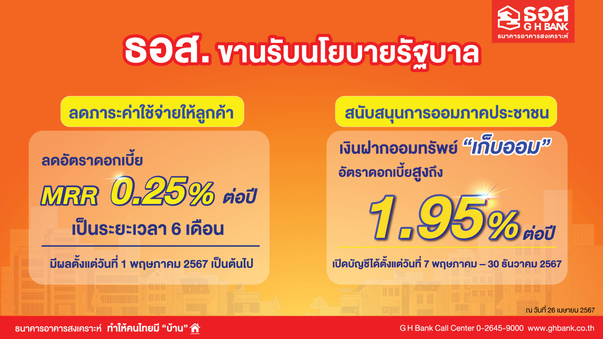 ธนาคารอาคารสงเคราะห์ (ธอส.) ขานรับนโยบายรัฐบาล ของนายเศรษฐา ทวีสิน นายกรัฐมนตรีและรัฐมนตรีว่าการกระทรวงการคลัง เพื่อช่วยลดภาระค่าใช้จ่ายให้กับลูกค้า ประกาศปรับลดอัตราดอกเบี้ยเงินกู้ MRR 0.25% ต่อปี มีผลตั้งแต่วันที่ 1 พฤษภาคม 2567 เป็นต้นไป พร้อมช่วยเพิ่มรายได้จากการออมให้กับประชาชน ด้วยการจัดทำ ผลิตภัณฑ์เงินฝากออมทรัพย์ “เก็บออม” อัตราดอกเบี้ยสูงถึง 1.95% ต่อปี เปิดบัญชีเงินฝากตั้งแต่วันที่ 7 พฤษภาคม – 30 ธันวาคม 2567