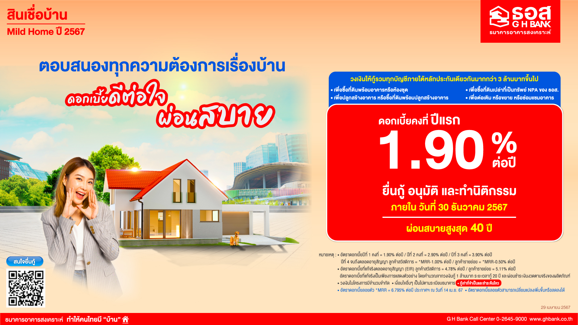 ธอส. สนับสนุนนโยบายรัฐบาลและกระทรวงการคลัง ส่งเสริมให้คนไทยมีบ้านเป็นของตนเองง่ายขึ้น จัดทำสินเชื่อ Mild Home ปี 2567 กรอบวงเงิน 10,000 ล้านบาท สำหรับที่อยู่อาศัยในระดับราคามากกว่า 3 ล้านบาทขึ้นไป อัตราดอกเบี้ยปีแรกเพียง 1.90% ต่อปี เฉลี่ย 3 ปีแรก 2.90% ต่อปี ระยะเวลากู้นานสูงสุด 40 ปี เงินงวดปีแรกเพียงล้านละ 2,500 บาทเท่านั้น! ผู้ที่สนใจสามารถยื่นคำขอกู้ได้ตั้งแต่วันนี้ และทำนิติกรรมภายในวันที่ 30 ธันวาคม 2567 ณ สาขาธนาคารทั่วประเทศ