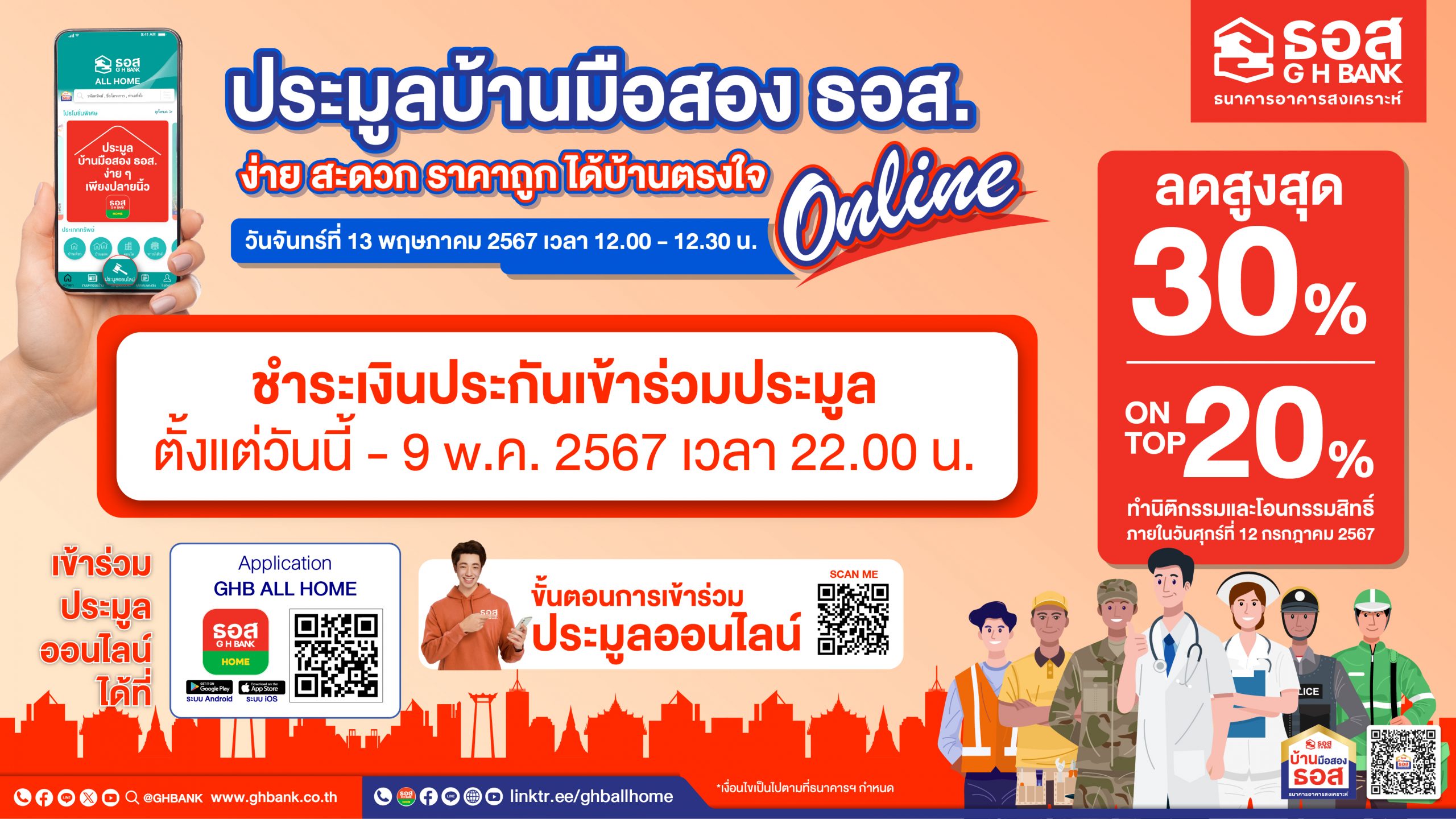 ธนาคารอาคารสงเคราะห์ เอาใจคนอยากมีบ้าน นำทรัพย์เด่น ทำเลดีมากกว่า 1,000 รายการทั่วประเทศ มาจำหน่ายในราคาพิเศษลดสูงสุด 30% จากราคาประเมิน ในงาน “ประมูลบ้านมือสองออนไลน์ : GHB’s NPA Online Auction 2024”  ผ่าน Application : GHB ALL HOME วันจันทร์ที่ 13 พฤษภาคม 2567 พิเศษ!! รับส่วนลด On Top เพิ่มอีก 20% จากราคาที่ปิดประมูล สำหรับผู้ชนะการประมูลที่ทำนิติกรรมและโอนกรรมสิทธิ์ภายใน วันศุกร์ที่ 12 กรกฎาคม 2567