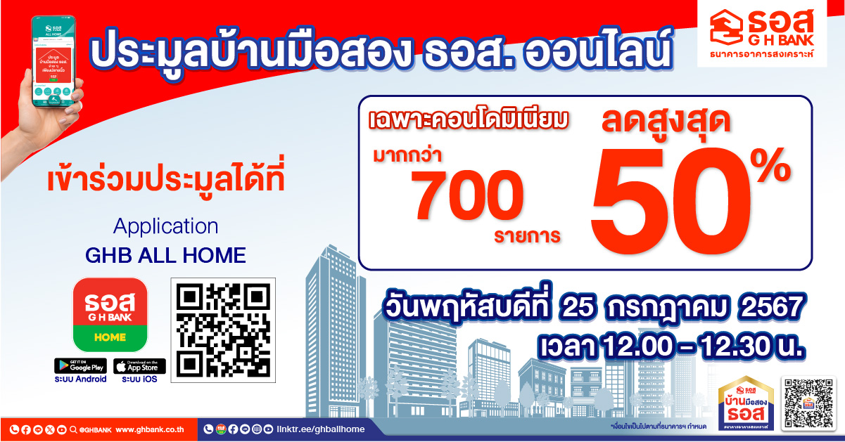 ธนาคารอาคารสงเคราะห์ (ธอส.) จัดกิจกรรมพิเศษเอาใจคนอยากมีคอนโดมิเนียมเป็นของตนเอง นำทรัพย์คุณภาพเด่น ทำเลดีกว่า 700 รายการทั่วประเทศ มาจำหน่ายในราคาพิเศษ ลดสูงสุด 50% จากราคาประเมิน ในงาน “ประมูลบ้านมือสองออนไลน์ : GHB’s NPA Online Auction 2024” ผ่าน Application : GHB ALL HOME วันพฤหัสบดีที่ 25 กรกฎาคม 2567 เวลา 12.00–12.30 น.