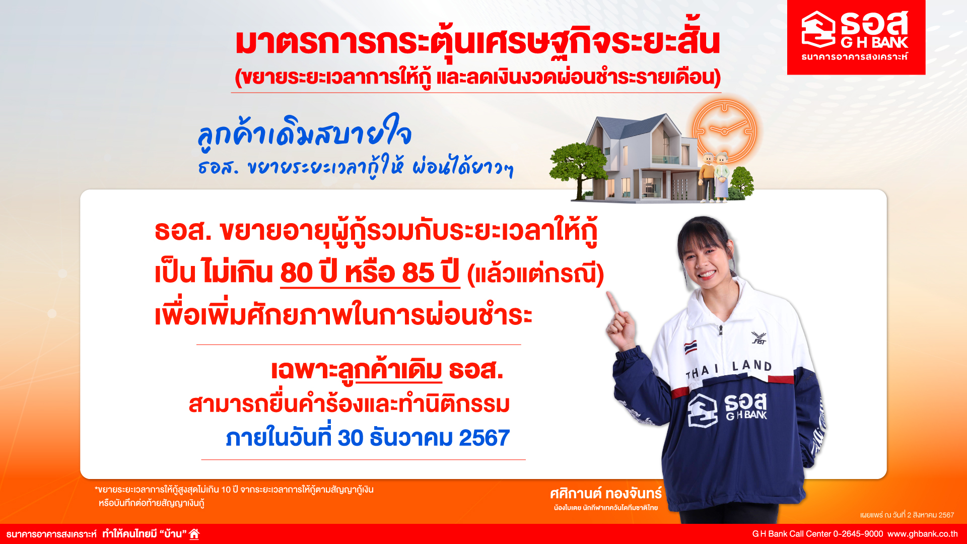 ธอส. ดำเนินการตามนโยบายรัฐบาล และกระทรวงการคลัง จัดทำมาตรการกระตุ้นเศรษฐกิจระยะสั้น ด้วยการขยายระยะเวลาให้ลูกค้าผ่อนชำระเงินงวดได้ไม่เกิน 80 ปี หรือ 85 ปี จากเดิมผ่อนชำระเงินงวดได้ไม่เกิน 70 ปี หรือ 75 ปี เพื่อช่วยลดภาระค่าครองชีพ และเพิ่มศักยภาพในการผ่อนชำระ ผู้ที่สนใจสามารถยื่นคำร้องและทำนิติกรรมได้ที่ ธอส. ทุกสาขาทั่วประเทศ ตั้งแต่วันนี้ถึงวันที่ 30 ธันวาคม 2567