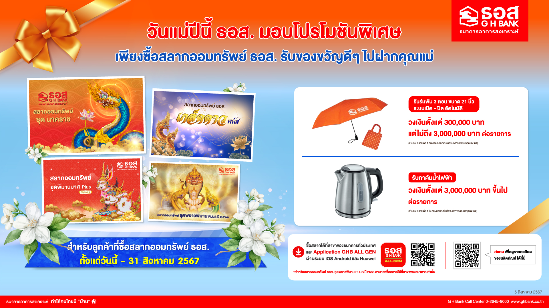 ธนาคารอาคารสงเคราะห์  (ธอส.) ชวนบอกรักแม่ ต้อนรับเทศกาลวันแม่แห่งชาติ ปี 2567 โดยจัดโปรโมชันพิเศษ สำหรับผู้ที่ซื้อสลากออมทรัพย์ ธอส. ชุดนาคราช, ชุดเกล็ดดาว Plus, ชุดพิมานมาศ Plus Phase 2 และชุดพราวพิมาน Plus ปี 2566 ตั้งแต่วันนี้ถึงวันที่ 31 สิงหาคม 2567 วงเงินตั้งแต่ 300,000 บาท แต่ไม่ถึง 3,000,000 บาท ต่อรายการ รับฟรีร่มพับ 3 ตอน ขนาด 21 นิ้ว ระบบเปิด-ปิด อัตโนมัติ จำนวน 1 ราย/1 คัน/ผลิตภัณฑ์ และวงเงินตั้งแต่ 3,000,000 บาท ขึ้นไป ต่อรายการ รับฟรีกาต้มน้ำไฟฟ้า จำนวน 1 ราย/1 ใบ/ผลิตภัณฑ์ สำหรับผู้ที่สนใจสลากออมทรัพย์ ธอส. สามารถซื้อได้ที่ Mobile Application : GHB ALL GEN หรือที่สาขา ธอส.ทั่วประเทศ
