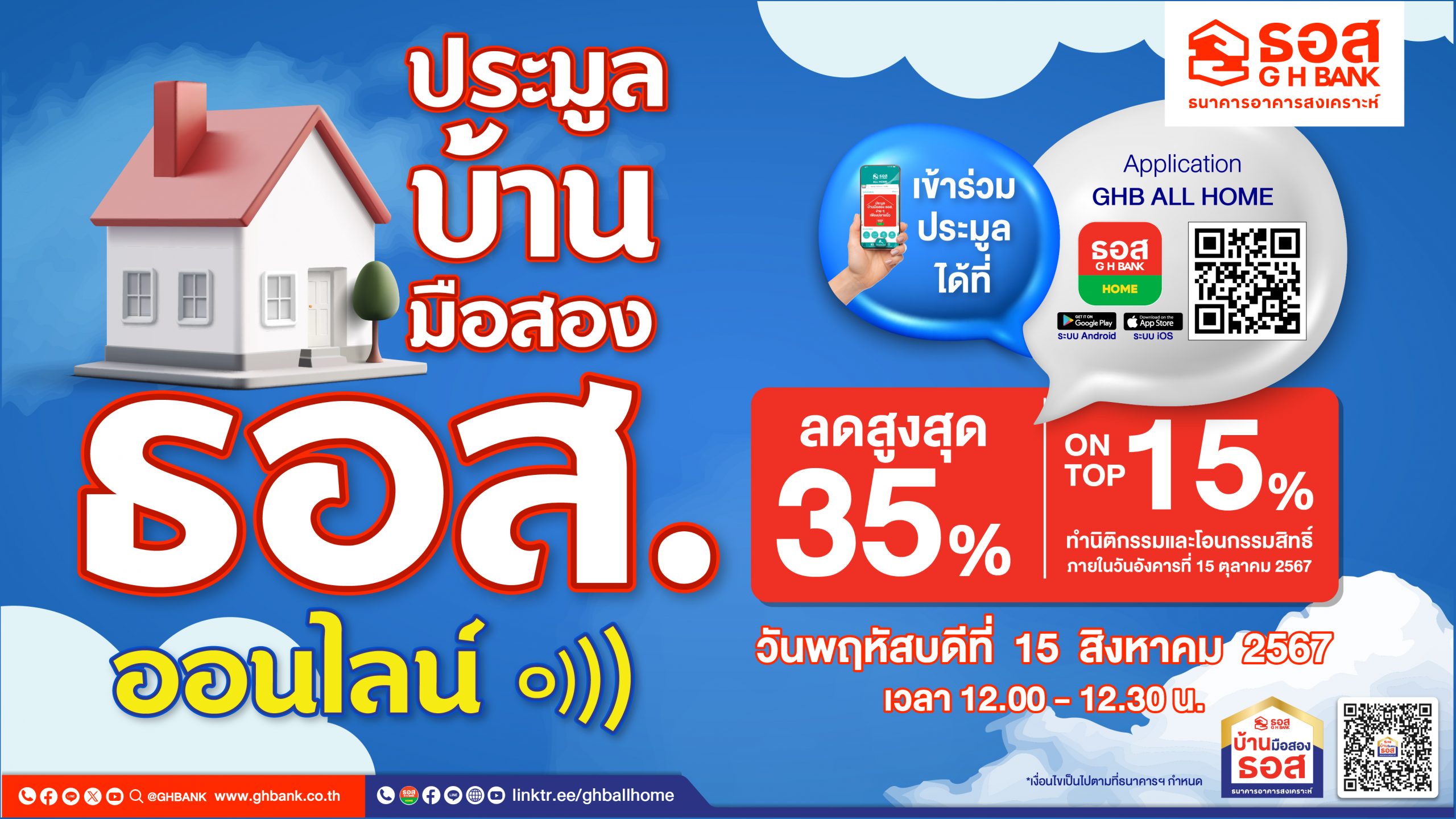 ธนาคารอาคารสงเคราะห์ เอาใจคนอยากมีบ้าน นำทรัพย์เด่น ทำเลดีมากกว่า 1,800 รายการทั่วประเทศ มาจำหน่ายในราคาพิเศษลดสูงสุด 35% จากราคาประเมิน ในงาน “ประมูลบ้านมือสองออนไลน์ : GHB’s NPA Online Auction 2024” ผ่าน Application : GHB ALL HOME วันพฤหัสบดีที่ 15 สิงหาคม 2567 สำหรับผู้ชนะการประมูลที่ทำนิติกรรมและโอนกรรมสิทธิ์ภายในวันอังคารที่ 15 ตุลาคม 2567 พิเศษ!! รับส่วนลด On Top เพิ่มอีก 15% จากราคาที่ปิดประมูล