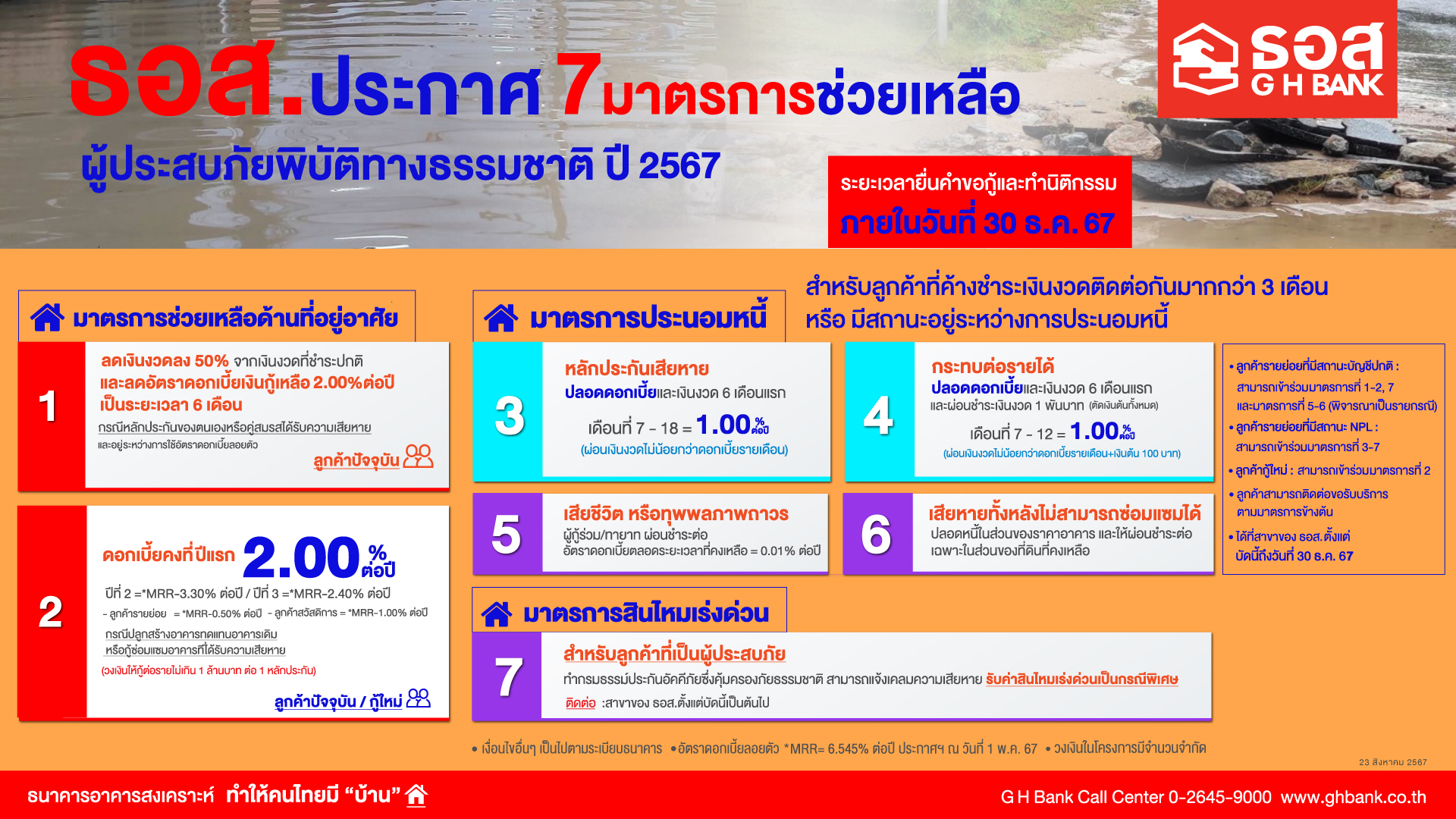 นายกมลภพ วีระพละ กรรมการผู้จัดการ ธนาคารอาคารสงเคราะห์ (ธอส.) เปิดเผยว่า ธอส. ในฐานะสถาบันการเงินของรัฐ ที่มีพันธกิจ “ทำให้คนไทยมีบ้าน” พร้อมร่วมส่งกำลังใจให้กับประชาชนในพื้นที่ภาคเหนือและพื้นที่ใกล้เคียง ที่ได้รับผลกระทบจากเหตุการณ์ฝนตกหนัก น้ำท่วมฉับพลัน น้ำป่าไหลหลาก ส่งผลให้ที่อยู่อาศัยและการประกอบอาชีพของประชาชนได้รับความเสียหายเป็นจำนวนมาก ธอส. จึงจัดทำ “มาตรการช่วยเหลือผู้ประสบภัยพิบัติทางธรรมชาติ ปี 2567” ทั้งสิ้น 7 มาตรการ เพื่อบรรเทาความเดือดร้อนให้แก่ลูกค้าประชาชน ประกอบด้วย